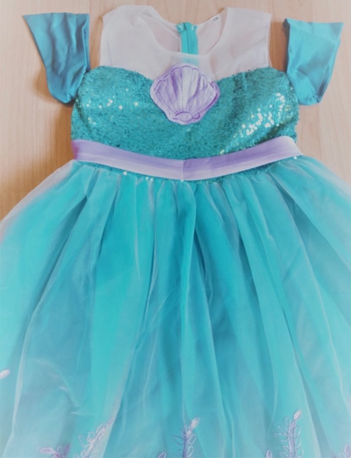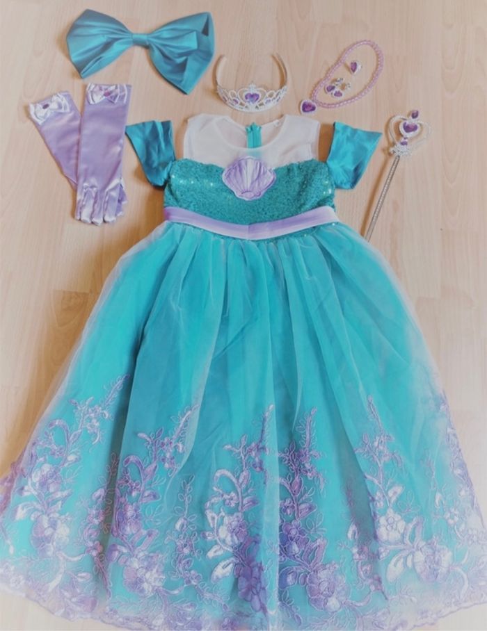 Déguisement robe sirène turquoise et violette et ces accessoires (couronne, baguette, gants, noeud). La robe mesure 90cm de longueur, la taille convient aux petites filles de 6ans. Totalement neuve, vendue dans son emballage d’origine. Expédition rapide après votre commande
