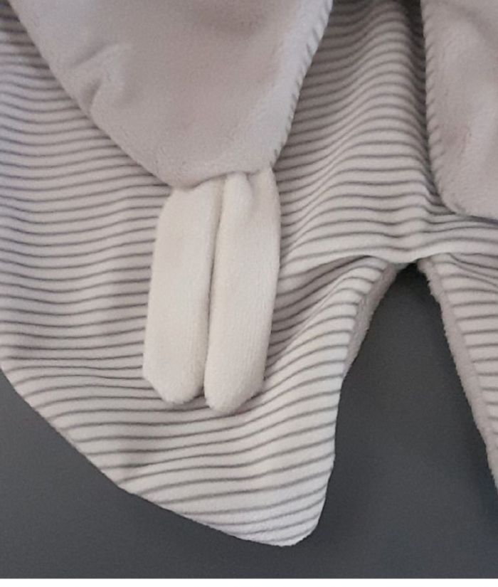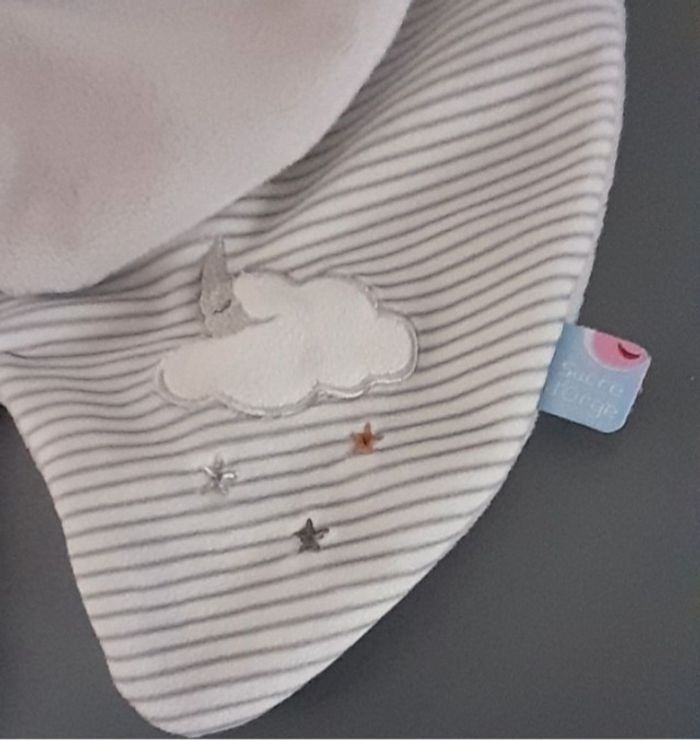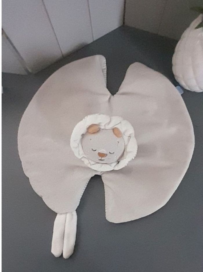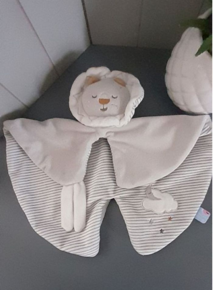 Doudou semi-plat lion 🦁 Sucre d'orge, gris très clair et blanc, qq touches de jaune moutarde, dessous rayé, lune nuage étoiles brodés, liens attache-tétine, yeux dormeurs, jamais servi