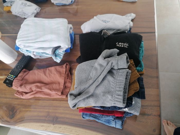 Vend lot de 9 moi garçons comprenant 6 pantalons 1 short 3 pull 3 bodys et 4 pyjama