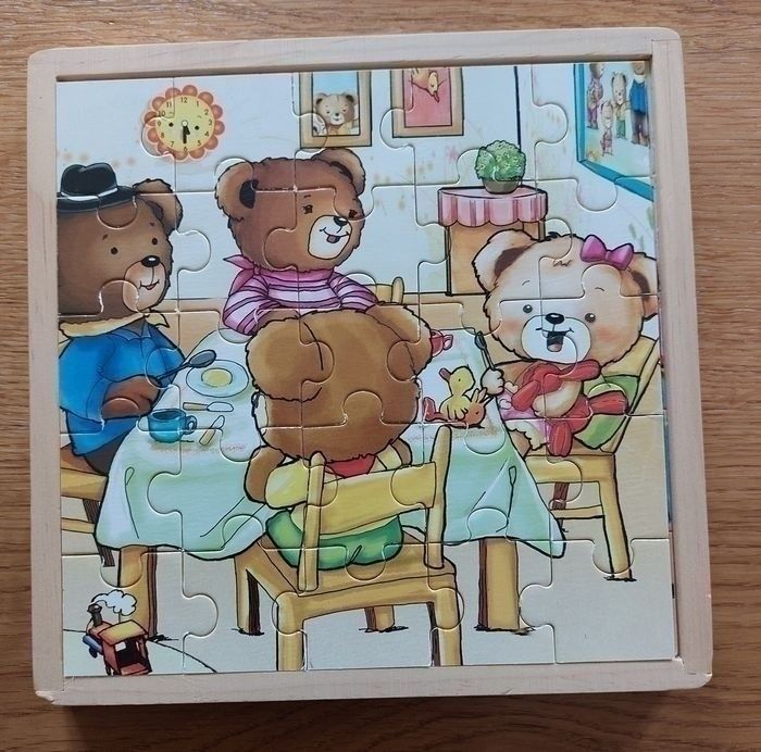 Lot de 3 puzzles en bois Famille ours (les 3 sont rangés et empilés dans la même boîte = 3 en 1) Thèmes : salle à manger, salon et chambre 25 pièces chacun J'ai édité une photocopie pour chacun d'entre eux qui seront jointes