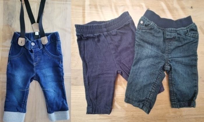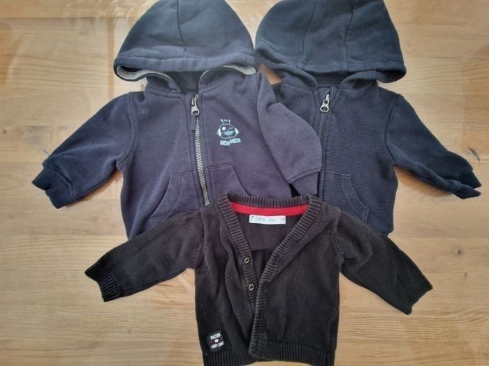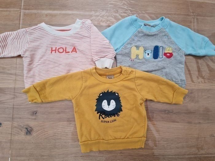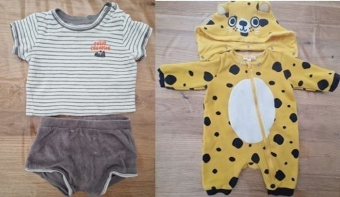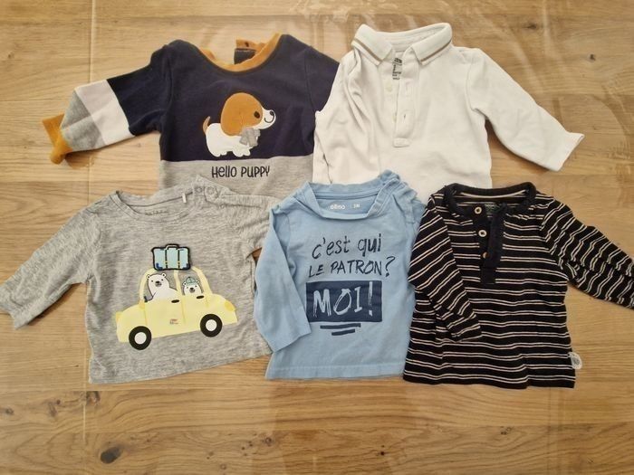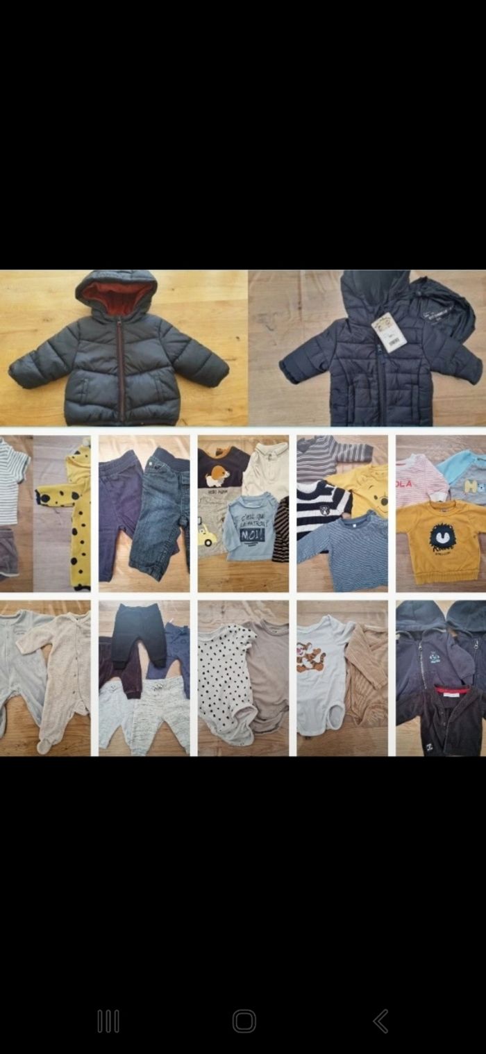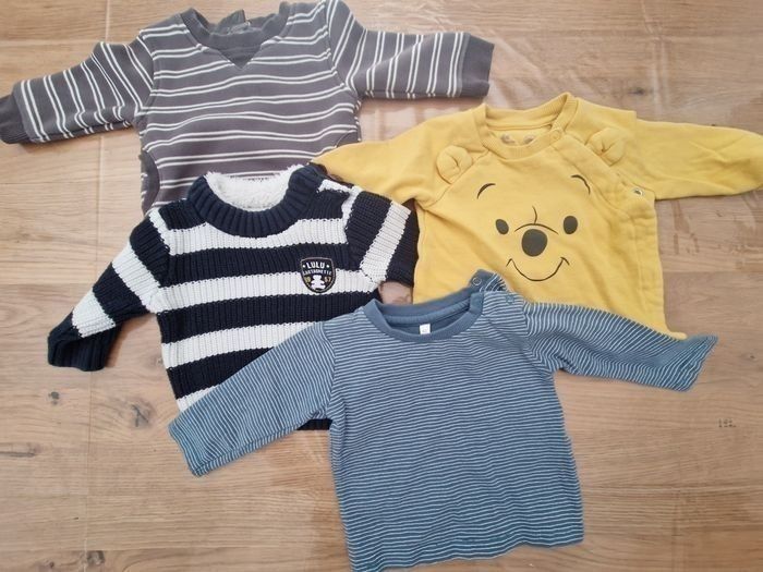 Composé de : - 2 Pyjamas - 2 Body MC - 2 Body ML - 5 Tee shirt ML - 3 Gilets - 7 Pulls - 5 Jogging - 3 Jeans - 2 Doudounes dont 1 neuve - 1 Combinaison - 1 Ensemble éponge (short + tee-shirt) Possibilité de vendre à l'unité Marques Gémo, Kiabi...