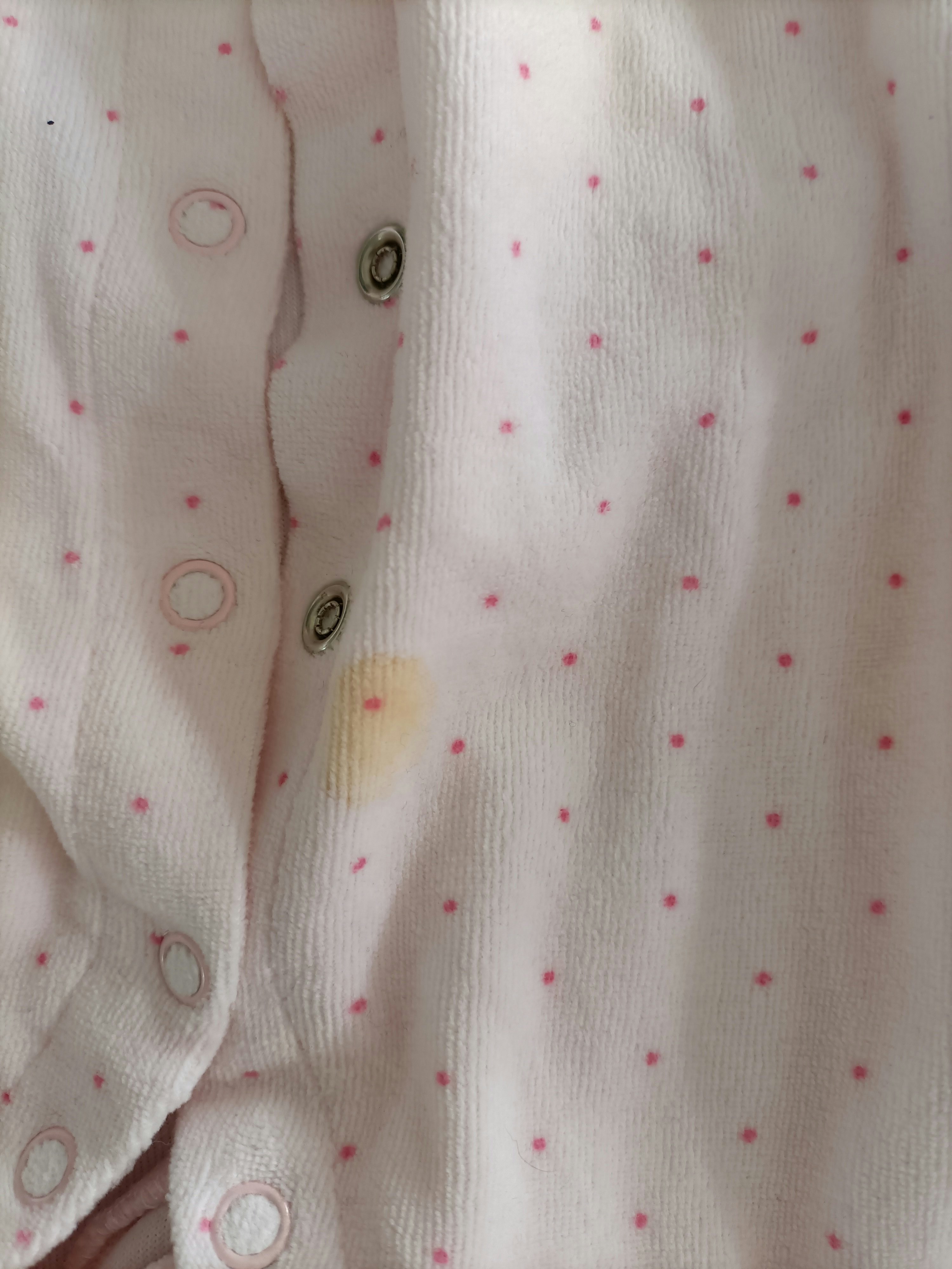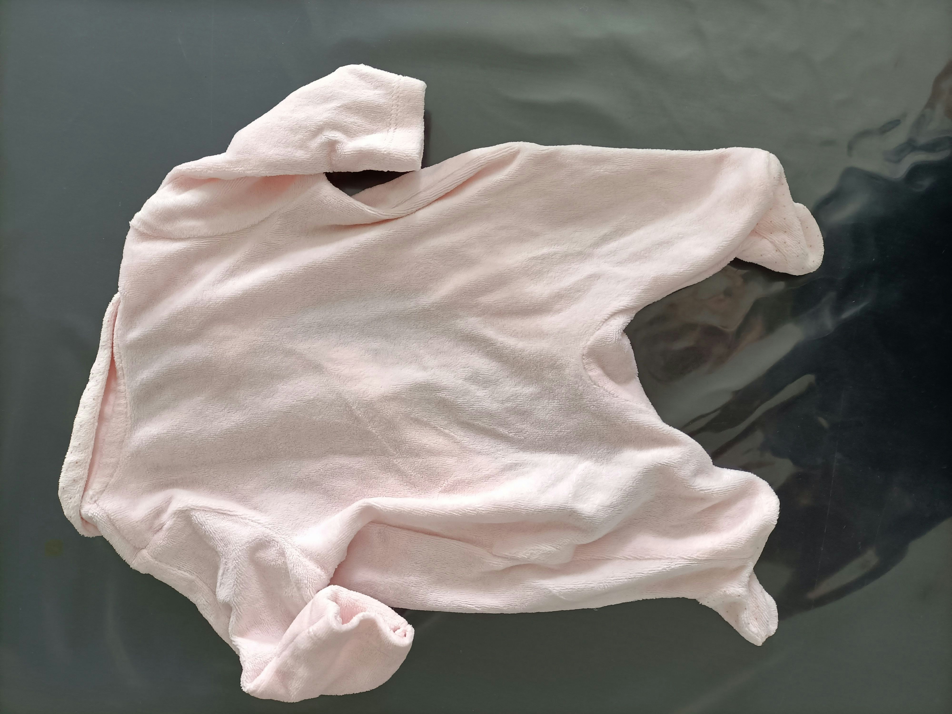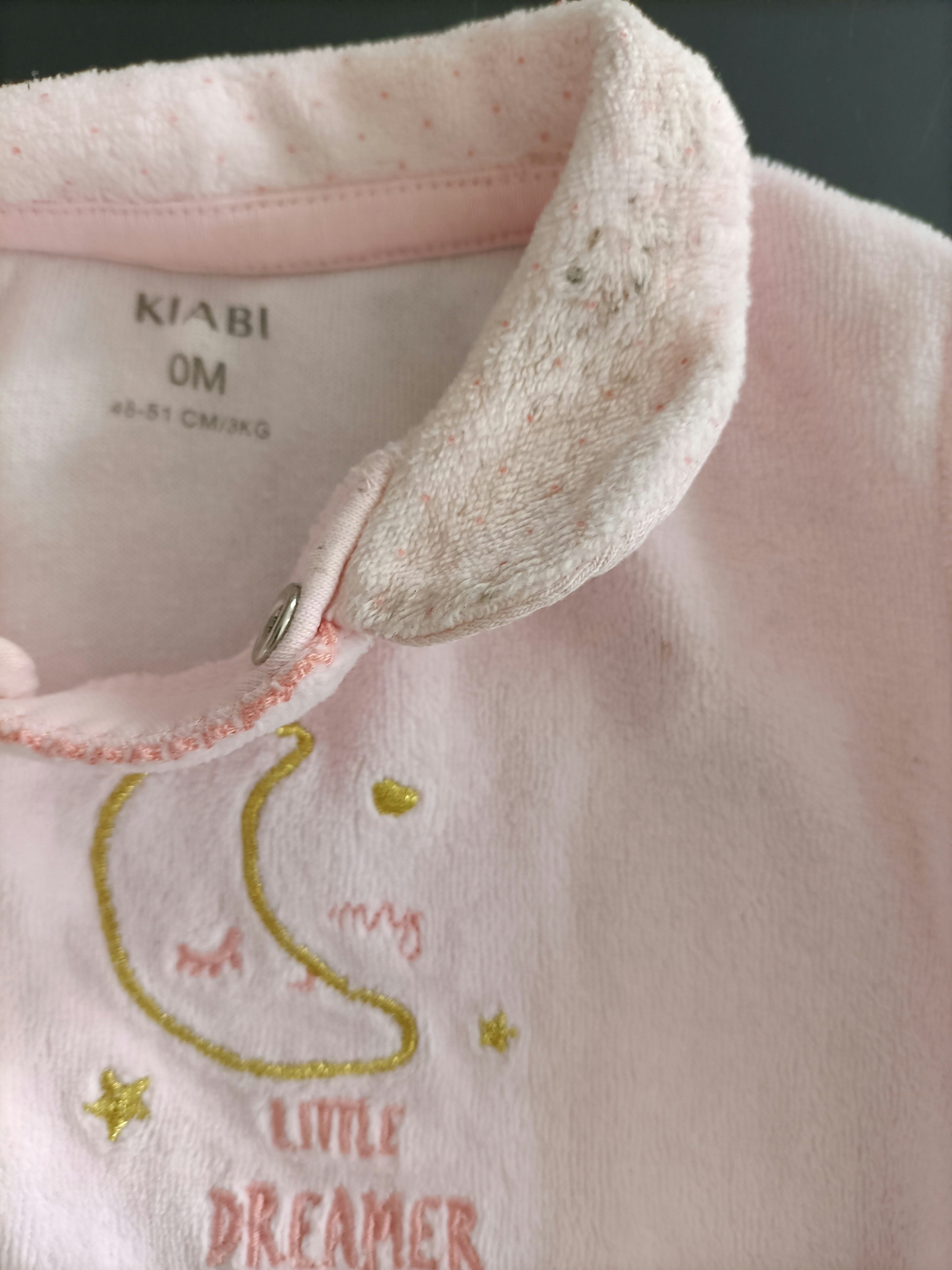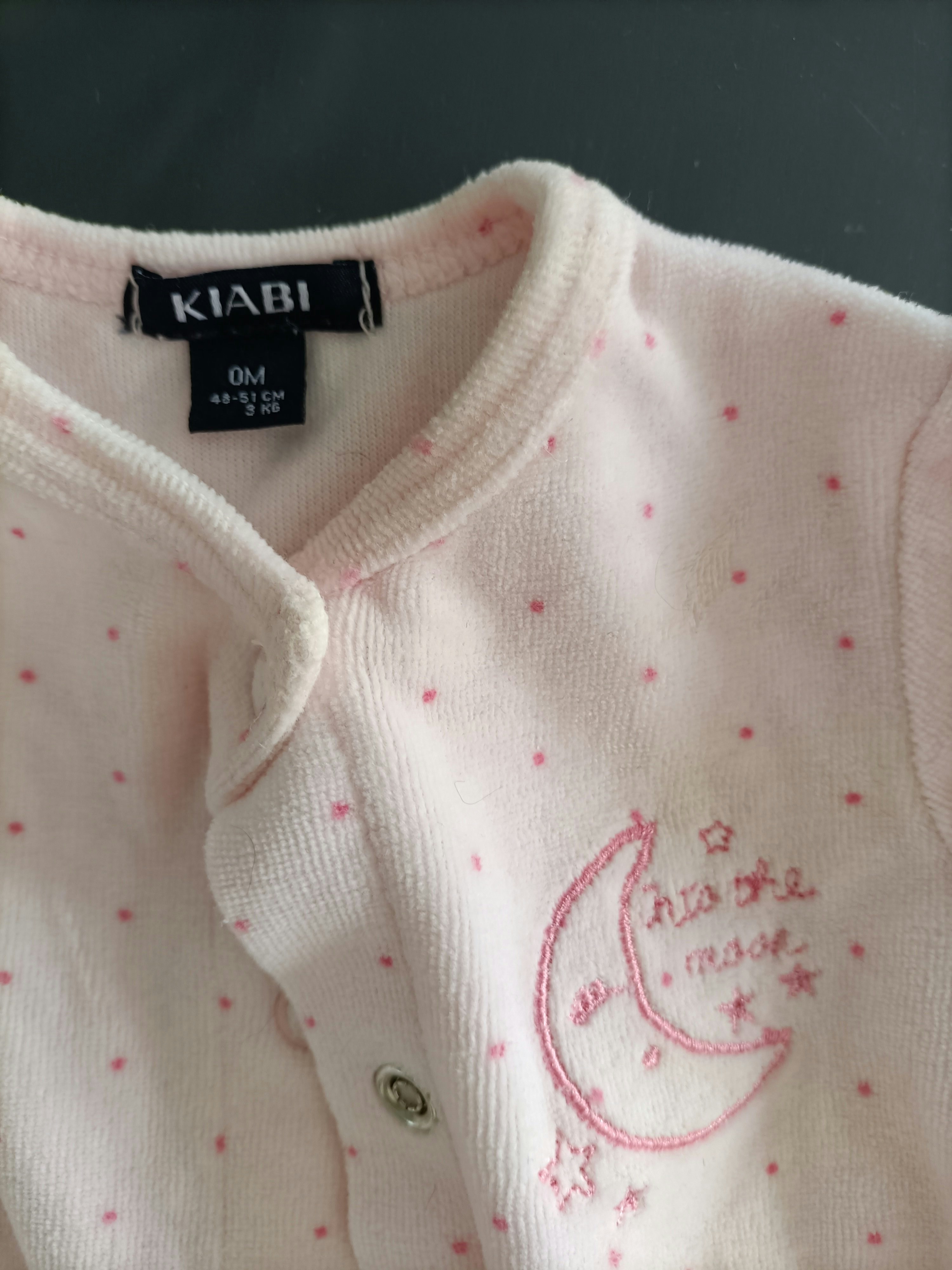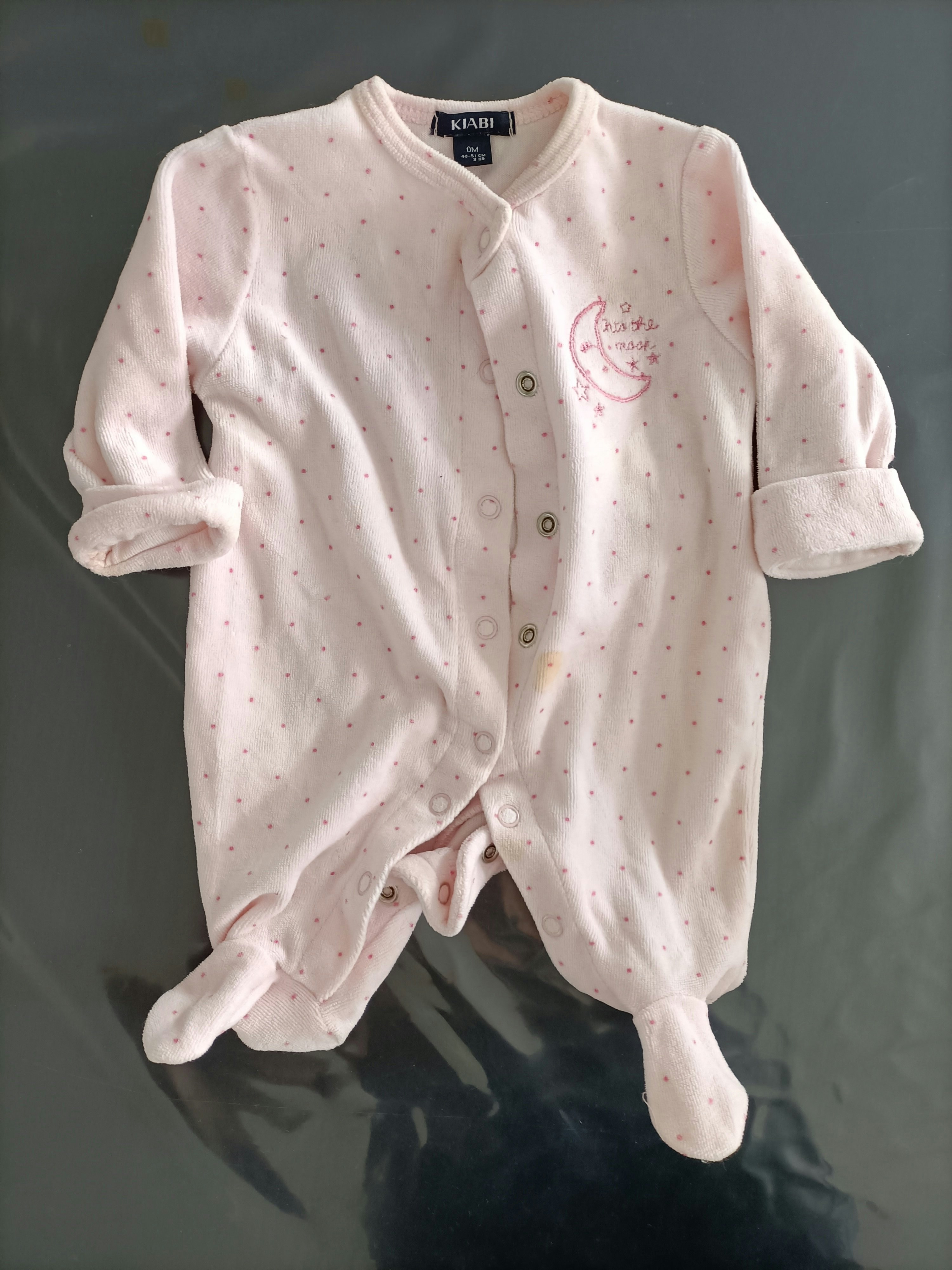 2 pyjamas rose en 1 mois. Portés avec quelques tâches de lait. Désinfectés et lavés, les tâches persistent, d'où le prix bas de mes articles.
