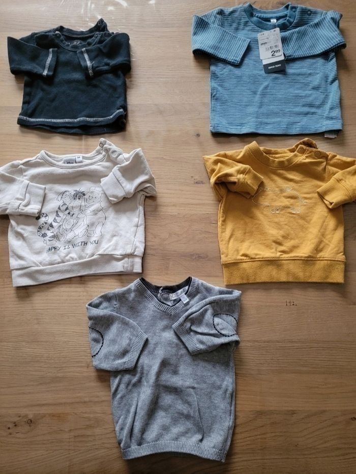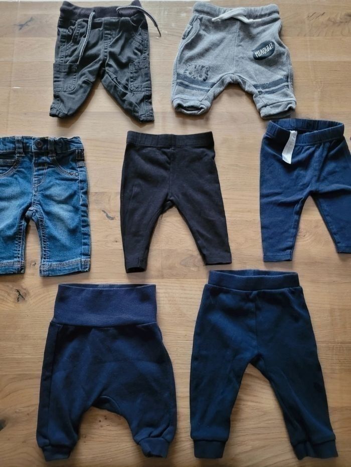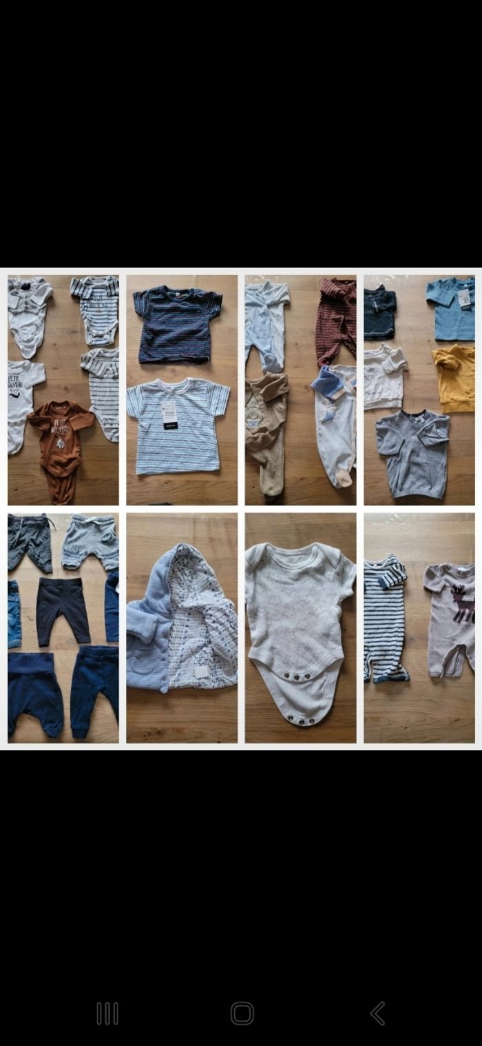 Lot Naissance -1 mois Garçon, composé de : (Possibilité de vendre à l'unité) - 4 Pyjamas - 1 Body MC - 5 Body ML - 2 Tee shirts MC dont 1 neuf - 1 Tee shirt ML - 4 Pulls dont 1 neuf - 4 Joggings - 2 Leggings - 1 Jean - 1 Manteau - 2 Combinaisons Marque Gémo, Kiabi...