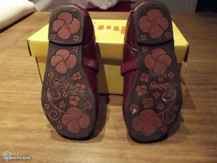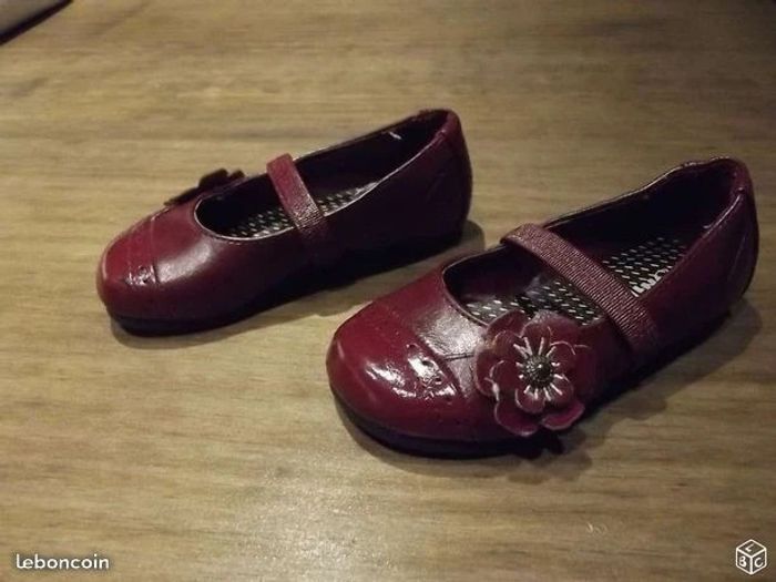 ballerines quasi neuves car portée une fois, coloris bordeaux, très bon état hormis un petit accroc sur le dessus de la chaussure, peu visible
