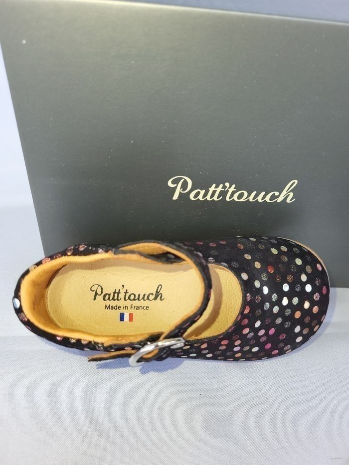 Charles IX tout en croûte velours souple noire avec impression pois multicolores, doublure et semelle intérieure en cuir beige, de la marque Patt'touch Fabrication de très belle qualité, 100% Française, dans un atelier familial près de Bordeaux Dimensions de la semelle intérieure : longueur 12.6 cm largeur 5.1 cm Emballage en coffret gris avec ruban écru au nom de la marque, idéal pour offrir ou se faire plaisir ! Neuf, jamais porté Envoi sous 24h
