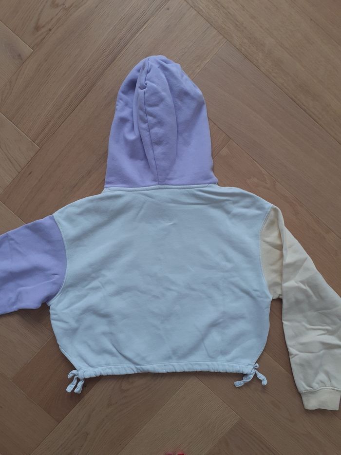 Pull à capuche de marque H&M ; Taille 10 / 12 ans ; Ton blanc, mauve et jaune ; En bon état (bouloche).