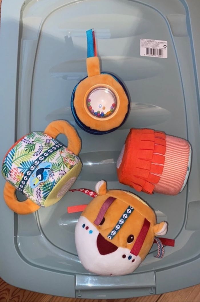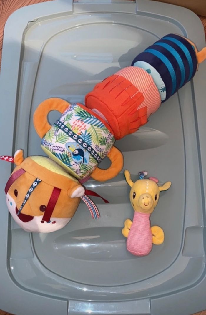 Un hochet girafe + rouleau d’activité jack le lion en 4 morceaux