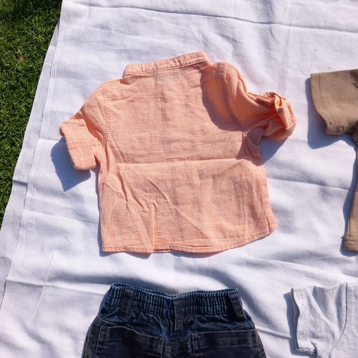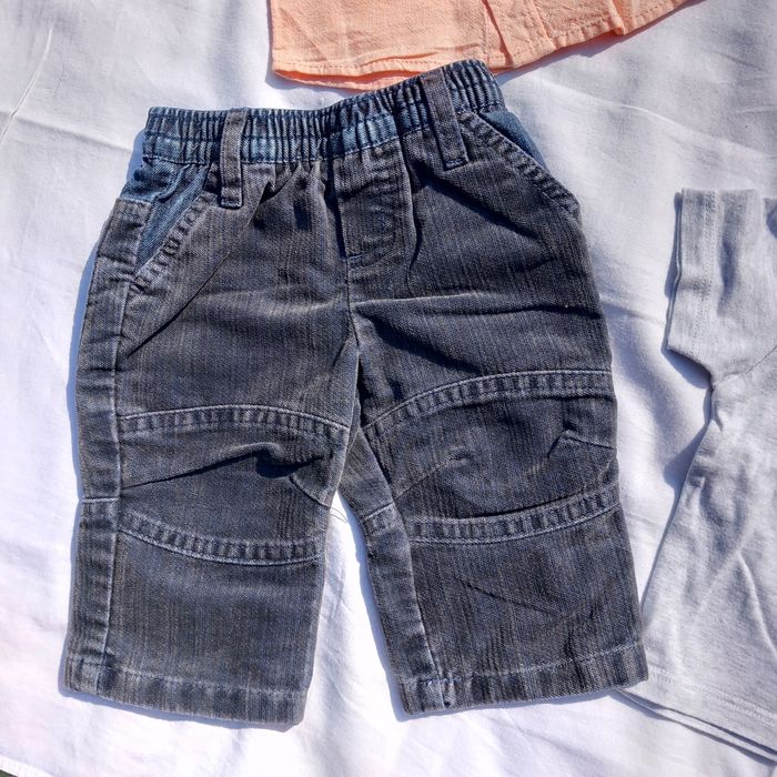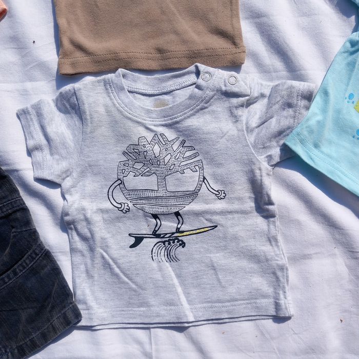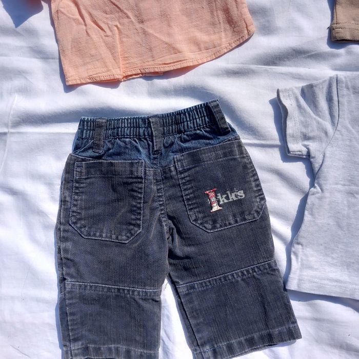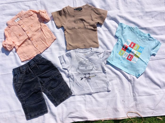 Chemise manches longues qui peuvent se retourner avec patte de fixation, Tape à l'œil, 2 poches boutons, fermeture boutons, col Mao, 2 boutons supplémentaires, 45% coton 55% lin Jeans Ikks, large élastique à la taille, ceinture avec passants, 4 poches, 50% coton 50% polyester Tee-shirt manches courtes Timberland, coloris gris, boutons pression sur l'épaule, dessin imprimé, 100% coton Tee-shirt manches courtes, coloris vert eau,inscription imprimée, boutons au dos Tee-shirt manches courtes Pas ke des Z'anges, taille 0-6 mois, coloris marron, inscription imprimée (ma tatie est géniale), boutons pression sur l'épaule, 100% coton Possibilité d offre en lots. Envoi rapide et soigné