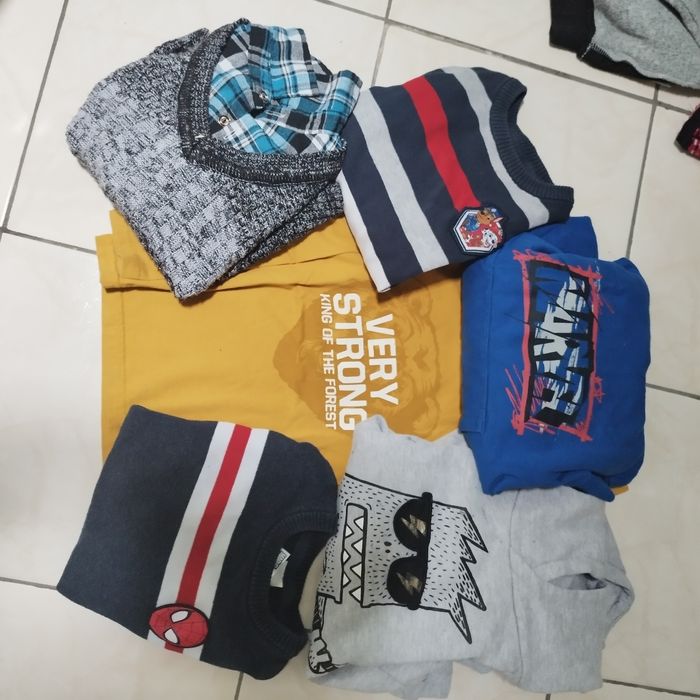 Lot de 6 pulls 2 à capuche 3 pulls chaud 1 léger ( le jaune ) Quelques tâches de crayon sur le pull gris (voir photo)