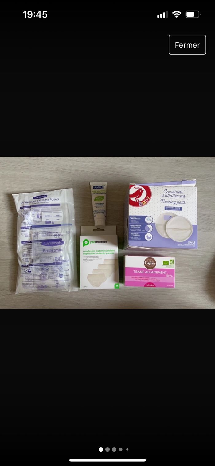 Contient: - 27 sachets de conservation lait maternel, - 1 boite neuve de culottes jetables (4), - 1 boîte de tisane pour l'allaitement (il manque 1 sachet dans la boîte, soit 19 au lieu de 20), - 1 baume allaitement (à mettre sur les tétons pour hydrater, apaiser et protéger. Utilisé une seul fois donc entier), - des coussinets d'allaitement (boîte ouverte, il en reste 19)