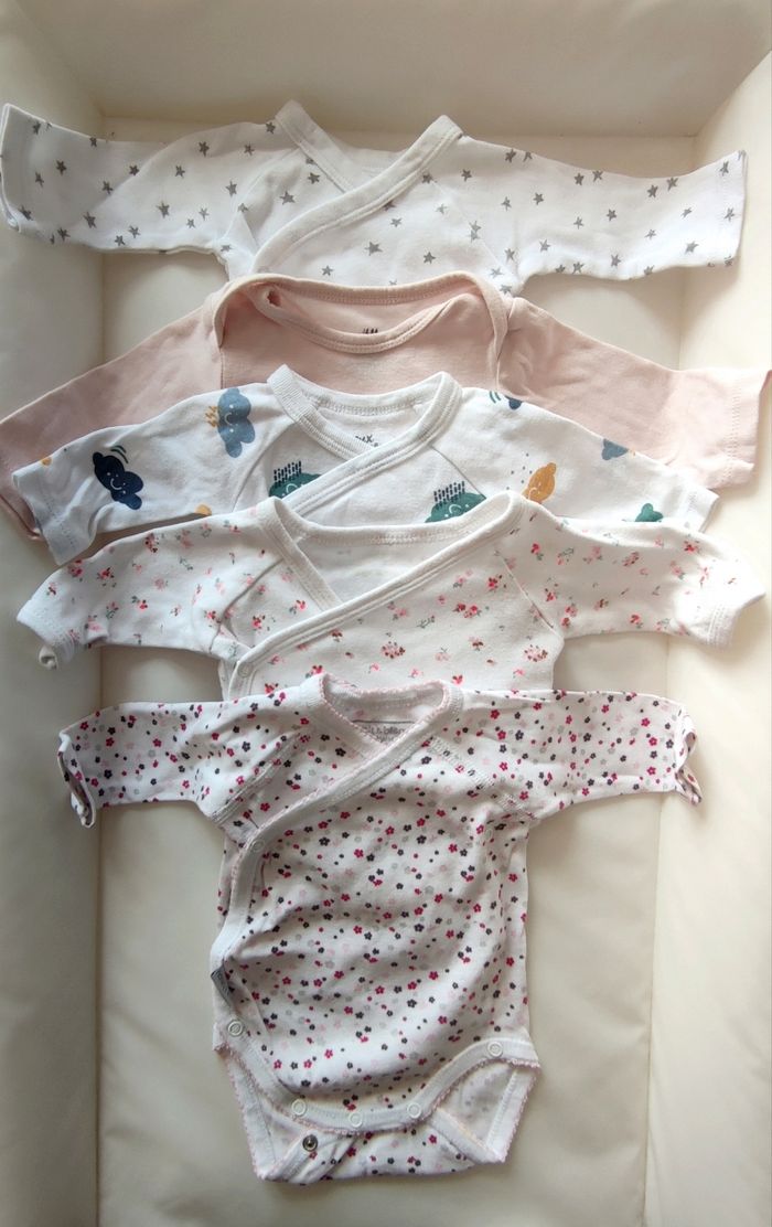 Lot 5 bodies - TO - plusieurs marques Pas des tâches Etoile - Gémo Rose - H&M Nuage - Gémo Fleurs - Vertbaudet Fleurs rose - P'tit Bisou