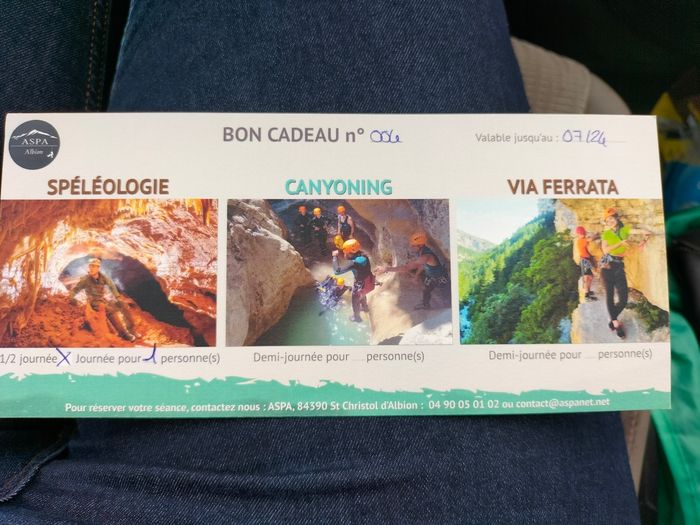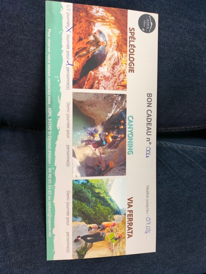 Place de spéléologie pour une personne valable jusqu en juillet 2024. Activités sympa que l on peut pratiquer seul ou en famille . Activité praticable dès l'âge de 4 ans