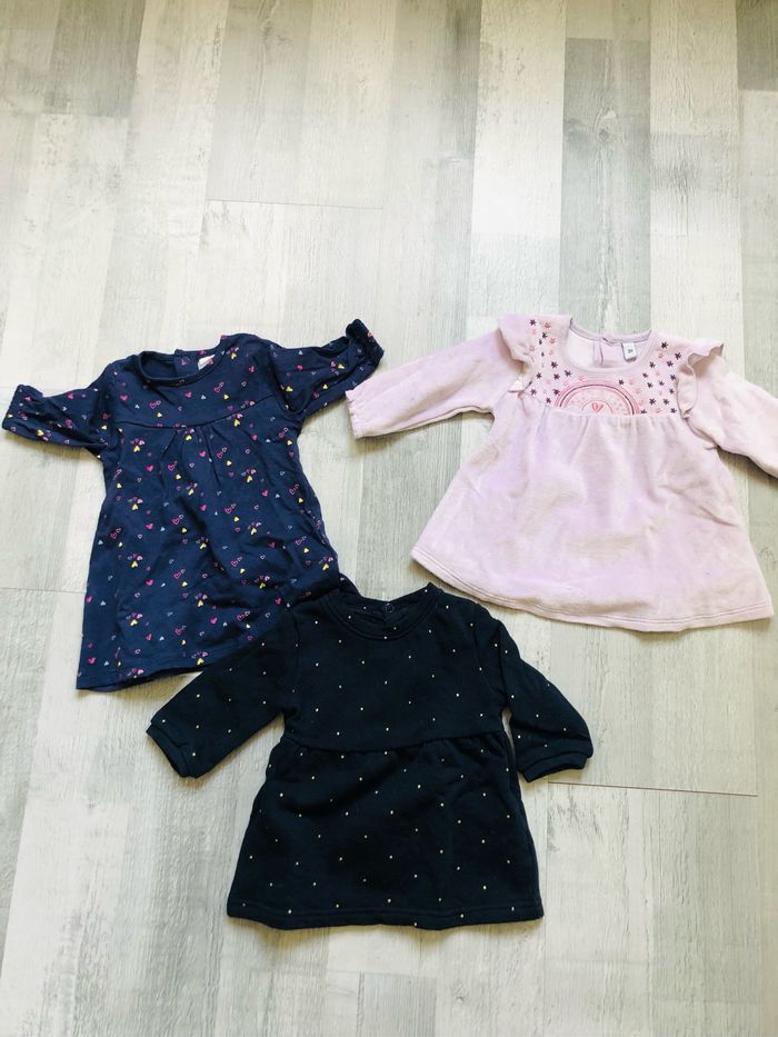 Vends 3 robes manches longues Très bon état Taille 3 mois Marque Kiabi Plus et Pat et ripaton