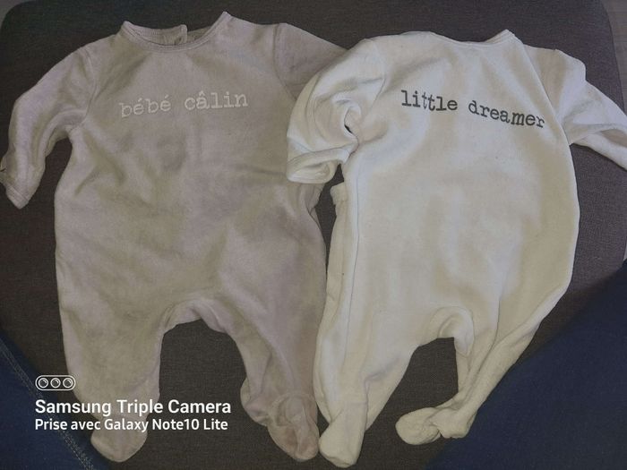 Le flocage "bebe câlin" sur pyjama gris un peu décoloré mais sinon parfait état idéal pour l'hiver pour garder bébé bien au chaud