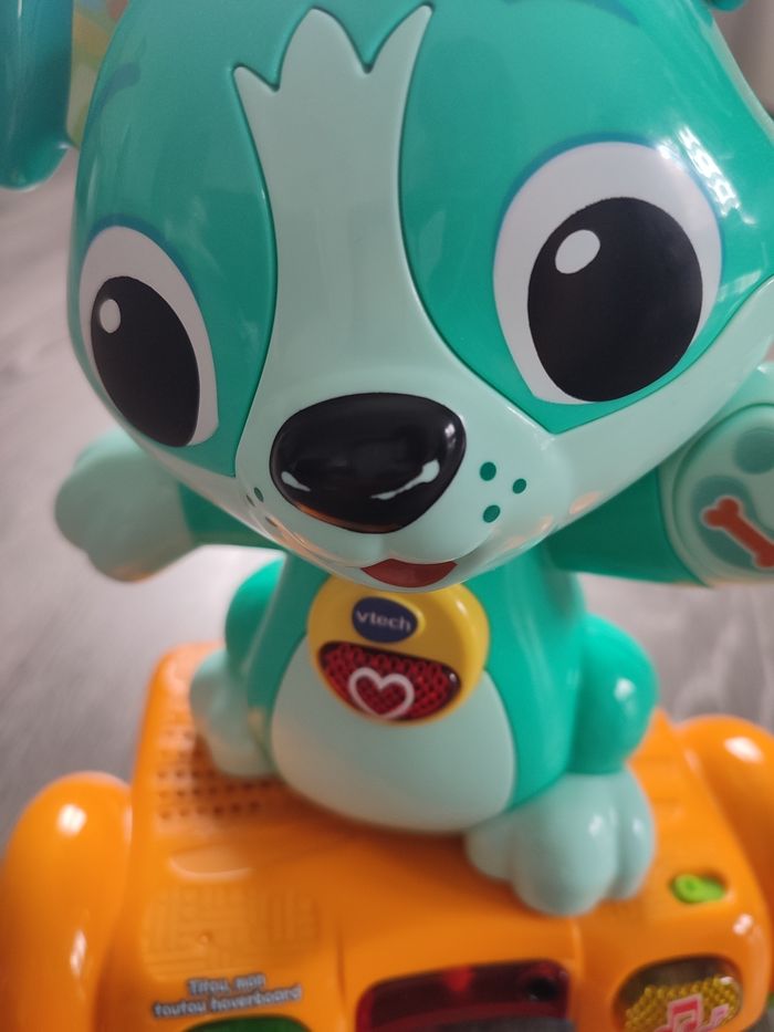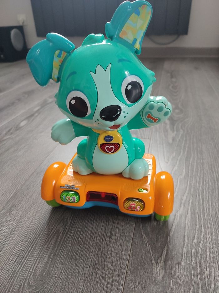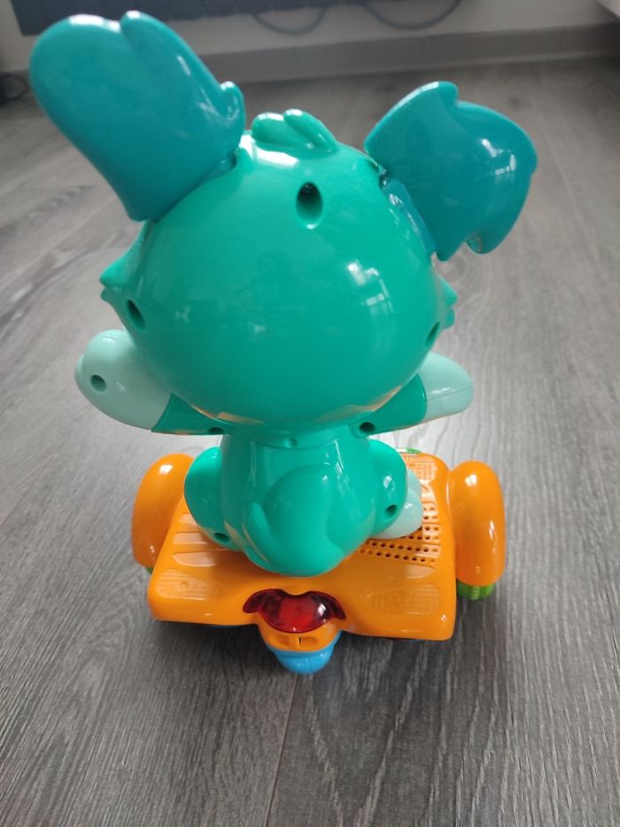 Jouet musical bon état un peu de peinture enlevée sur le nez (cf photo 4) mais fonctionne parfaitement. Je n'ai plus la boîte d'origine ni la notice mais très facile d'utilisation. Il parle et avance tout seul. Convient aux enfants de 1 à 3 ans. Vendu neuf actuellement une trentaine d' euros