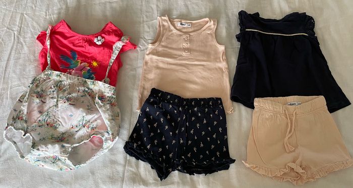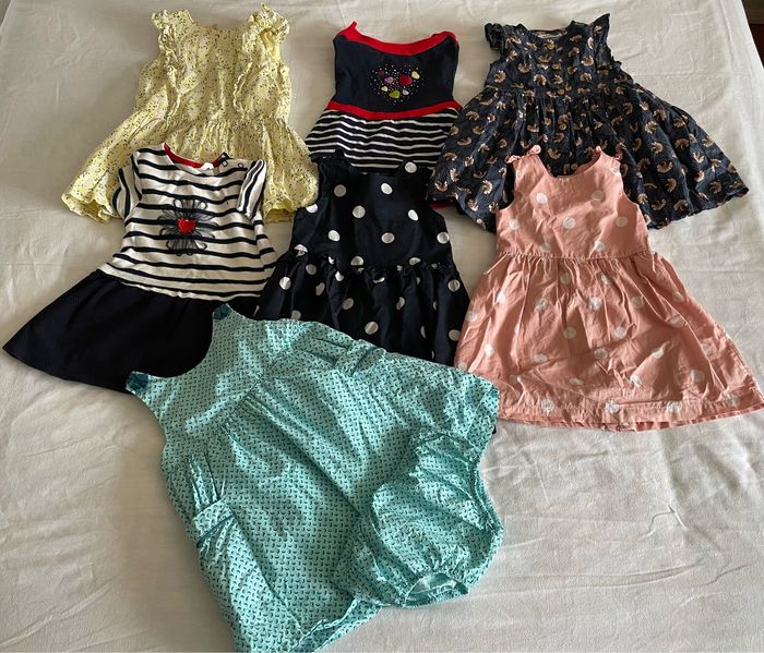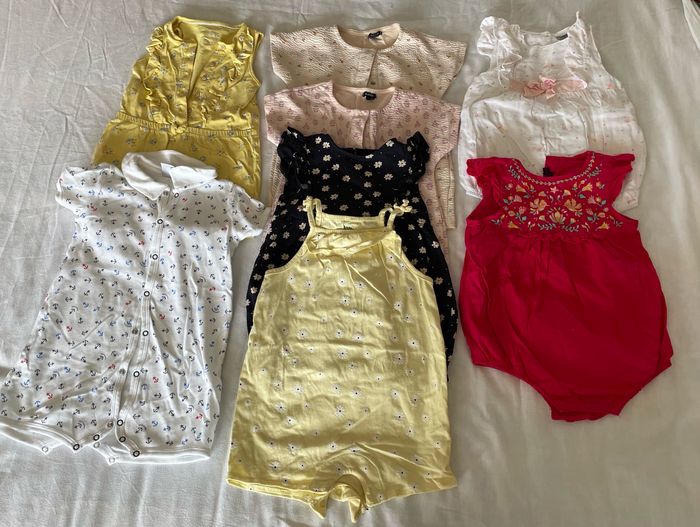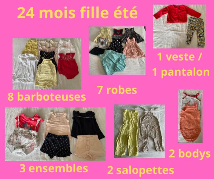 27 pièces été fille 24 mois -2 salopettes (gémo et sergent major) -7 robes (okaidi, Gemo, kiabi, orchestra) -8 barboteuses (4 kiabi, 2 sergent major, petit bateau) -2 ensembles tee shirts , short (gémo) -1 salopette short (sergent major) -2 body ( en cadeaux 10 autres body) -1 veste rose + 1 pantalon léger ( gemo)