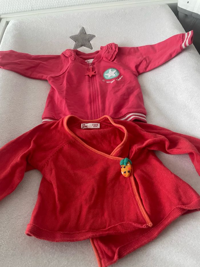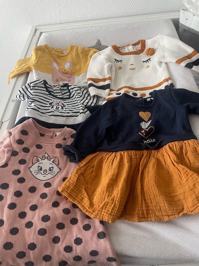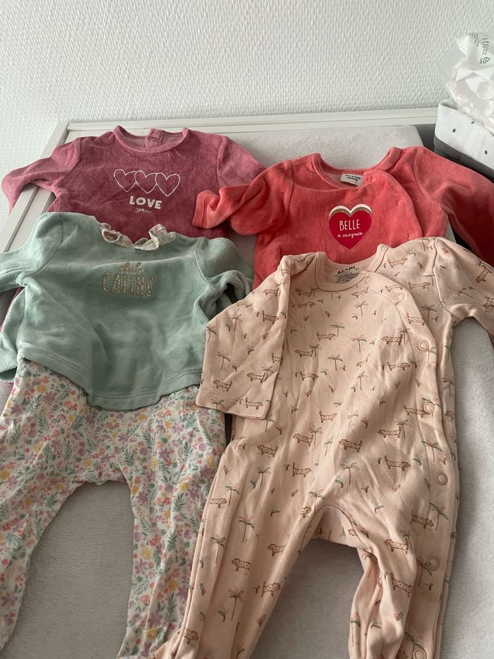 15 bodys , 4 hauts à manche longue , 1 débardeur , 4 pyjamas , 5 robes , 5 pantalons et 2 gilets en parfait état de différentes marque ( orchestra , du pareil au même , tape à l’œil …) remis uniquement en main propre