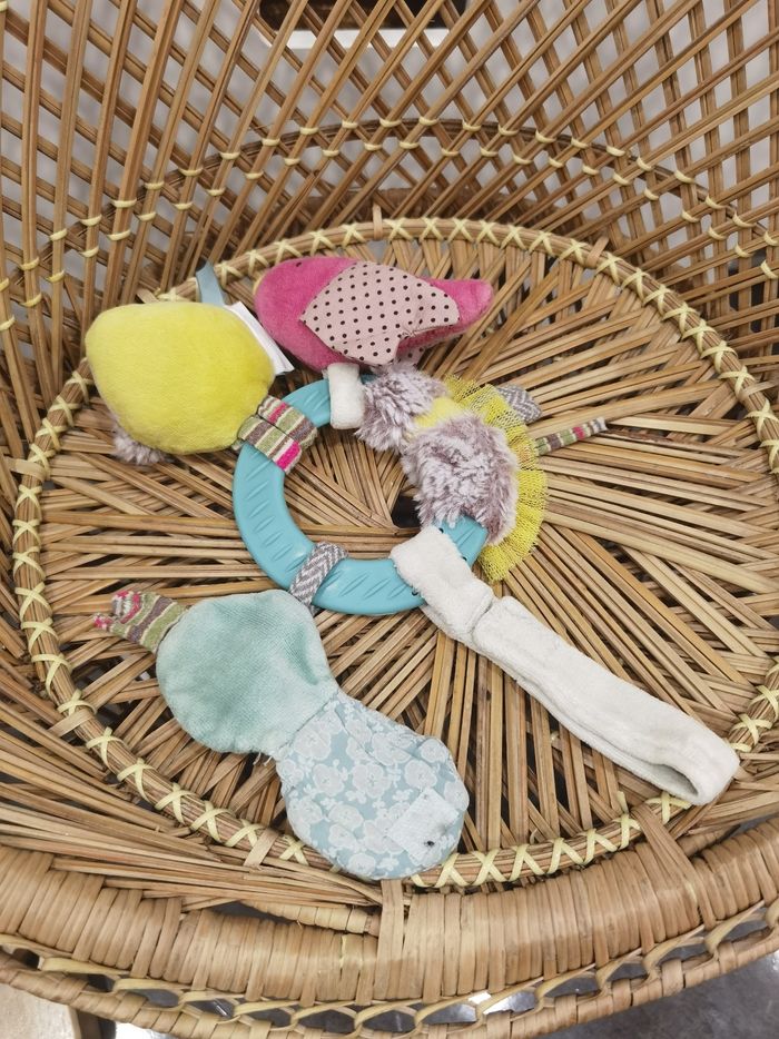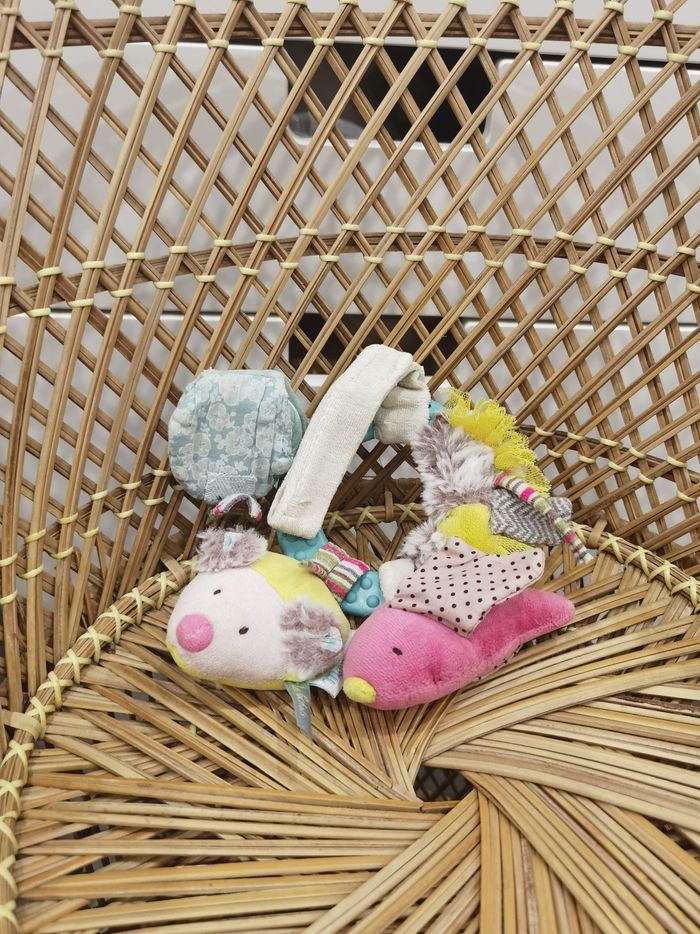 Moulin roty, les pachats Anneaux d'activités un copain oiseau, hochet avec papier crissant, une petite souris pouët pouët, un petit miroir, un éventail de tissus, tulle, fourrure et un ruban attache tétine/autre. Très bon état Miroir légèrement plié. Idéal pour accrocher à la poussette ou pour occuper bébé dans la voiture