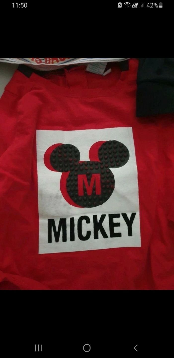 Ensemble pantalon gilet porté 1 fois Le pull rouge voir dernière photos le noir du Mickey a un peu décoloré sur le blanc