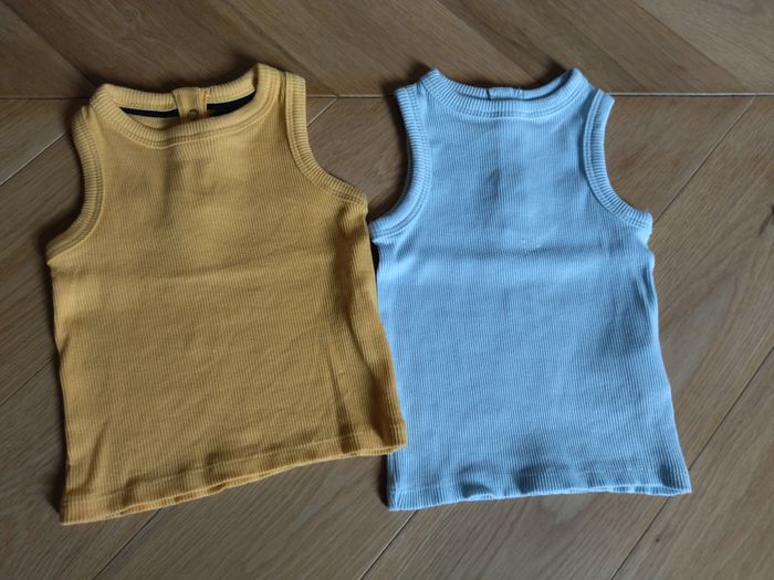 Très bon état, t-shirts 6M , sans manches, bleu ciel et jaune moutarde, Kiabi