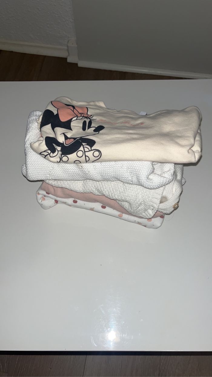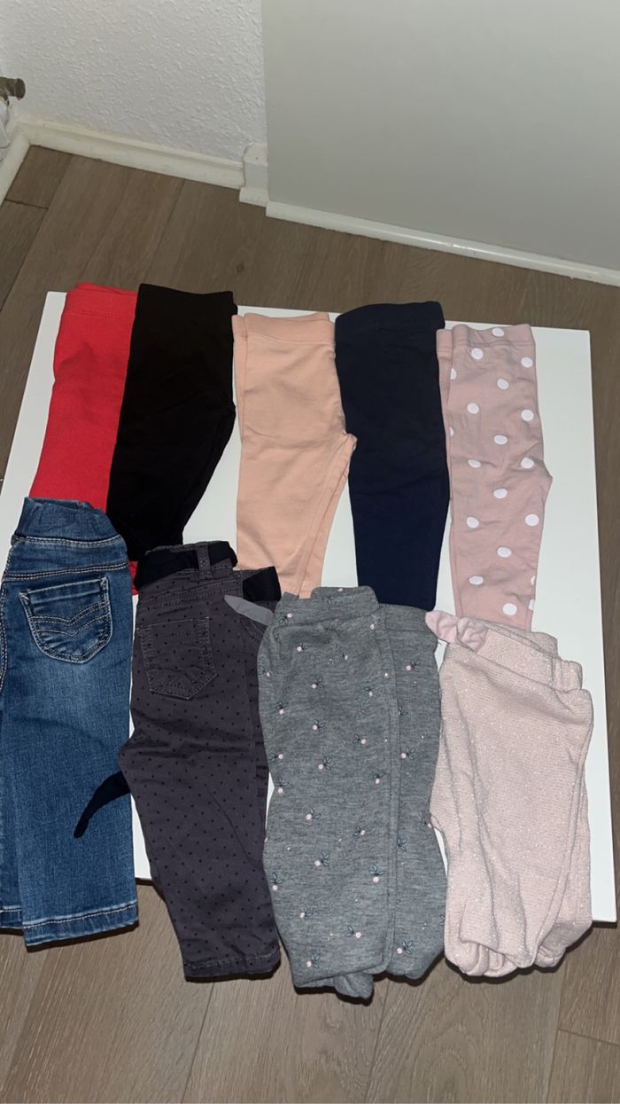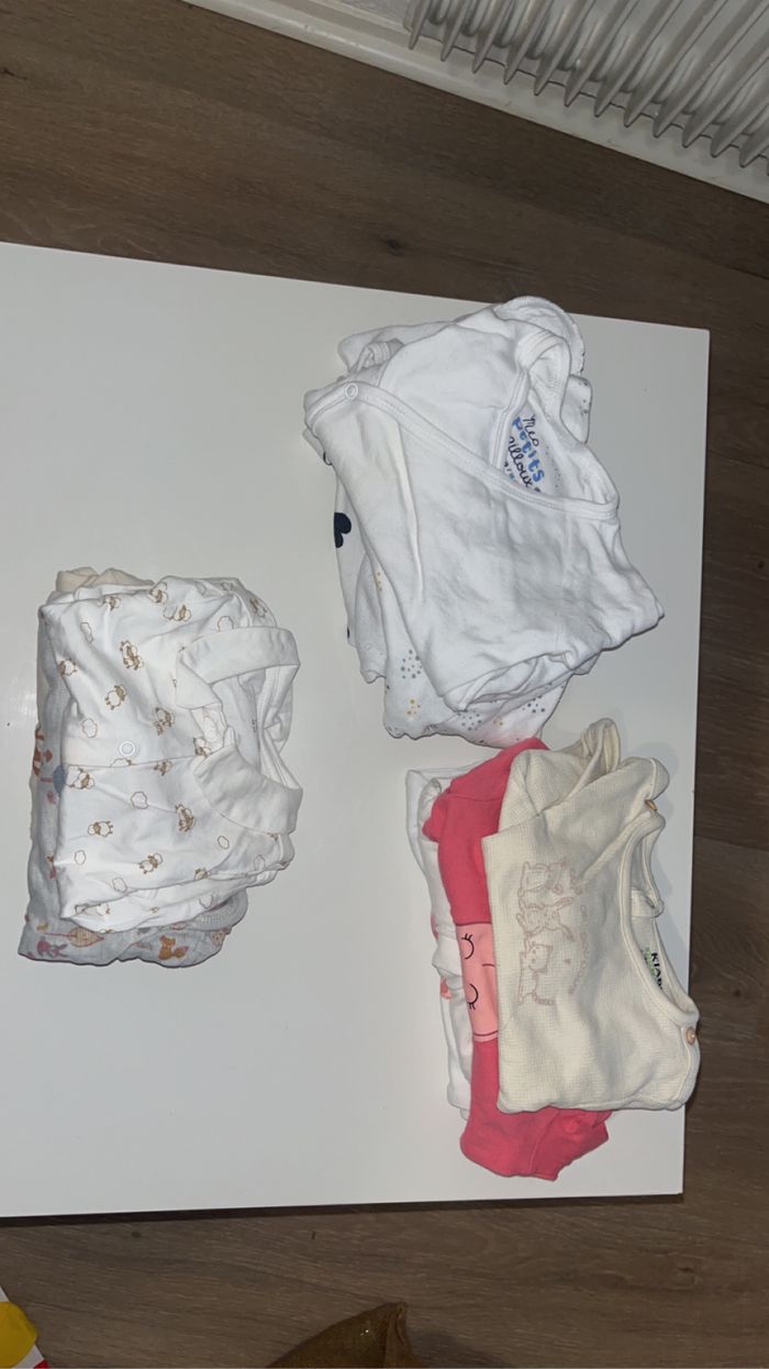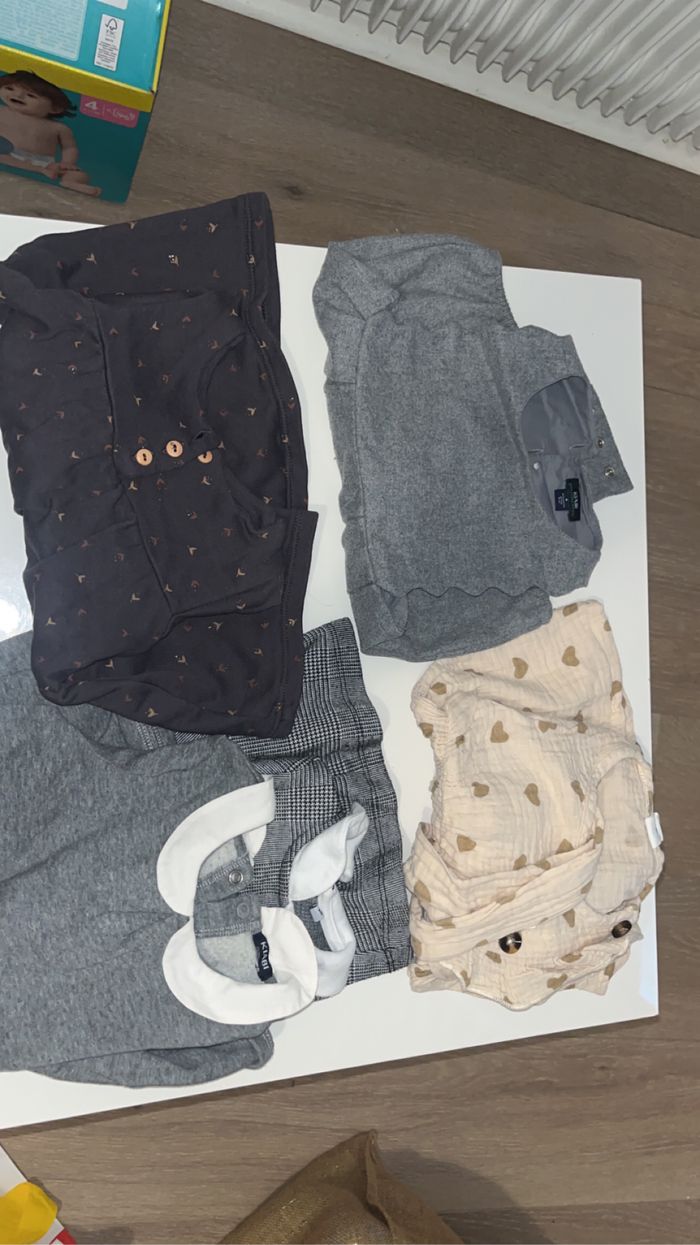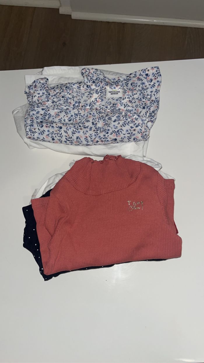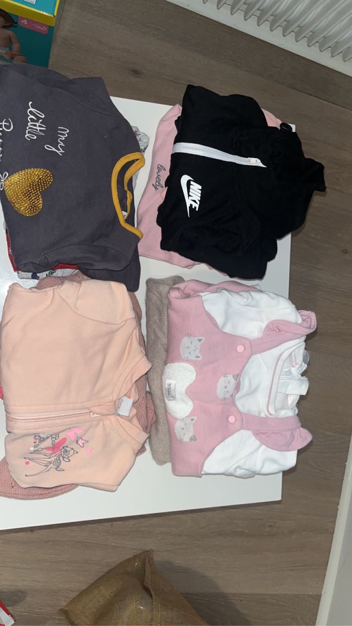 16 pyjamas 15 bodys manches longues 5 robes 10 ensembles 5 leggings 2 jeans 2 pantalons 5 collants 5 tee shirts manches longues 2 chemises manches longues 6 pulls 1 tee shirt manche longues anti UV 1 veste sans manches Marques : Kiabi, orchestra, mayoral, du pareil au même, la compagnie des petits, tape à l’œil….