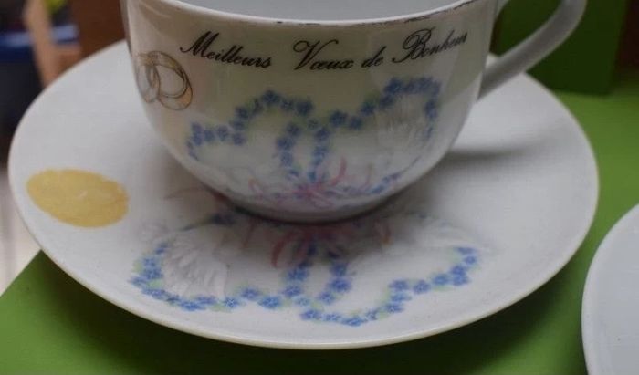 vends un service se composant de 2 bols avec anses et leurs assiettes pour soucoupes. Mariage. inscription Meilleurs Voeux de Bonheur sur les bols. Les bols mesurent 7 cm de haut et 10,5 cm de largeur. Vintage.
