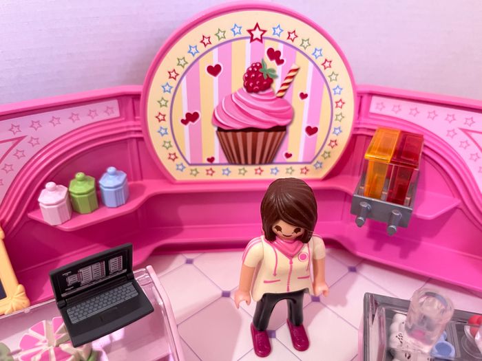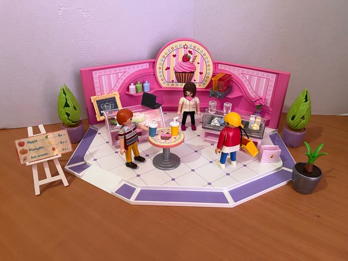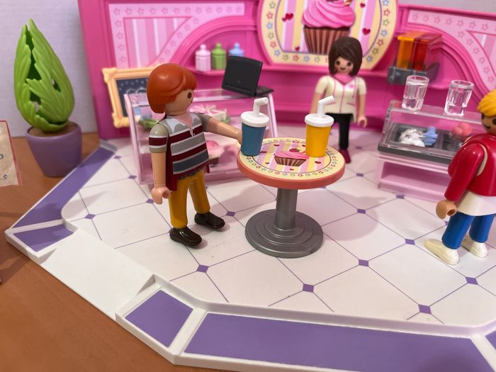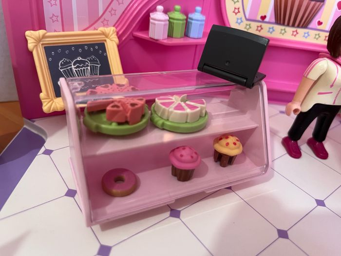 Très bon état Voir photos pour tous les éléments fournis (gâteaux, glacés, frigos, appareil à granité, …) 3 personnages Très joli
