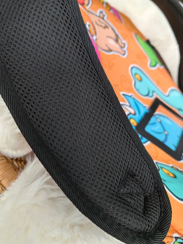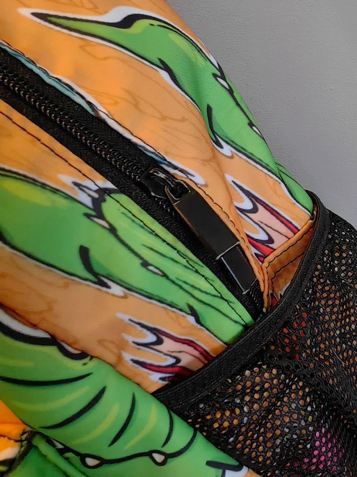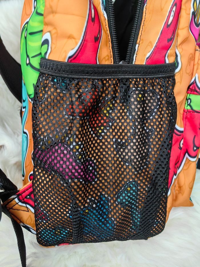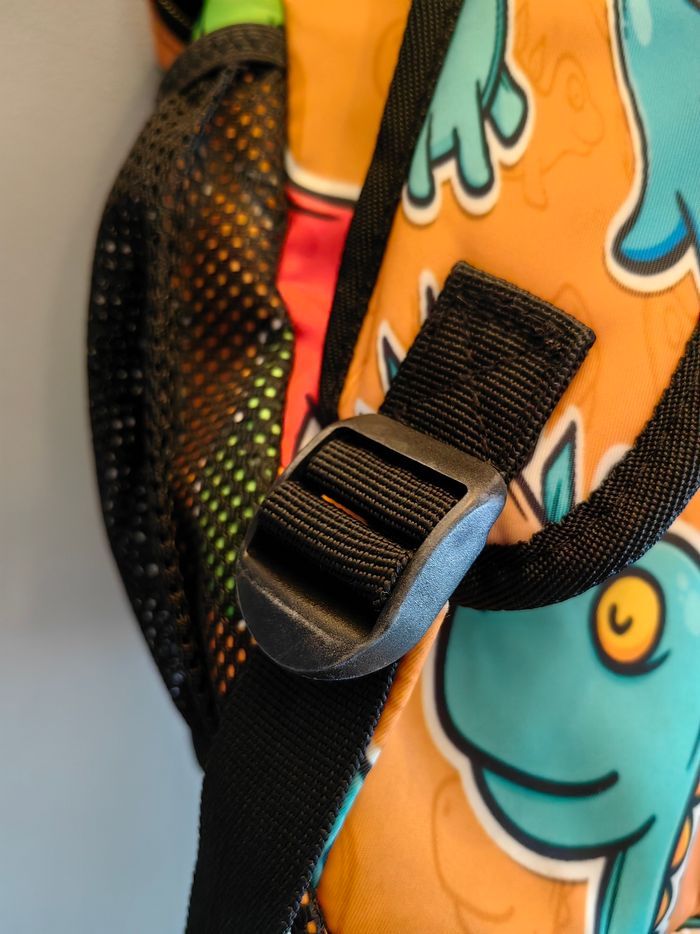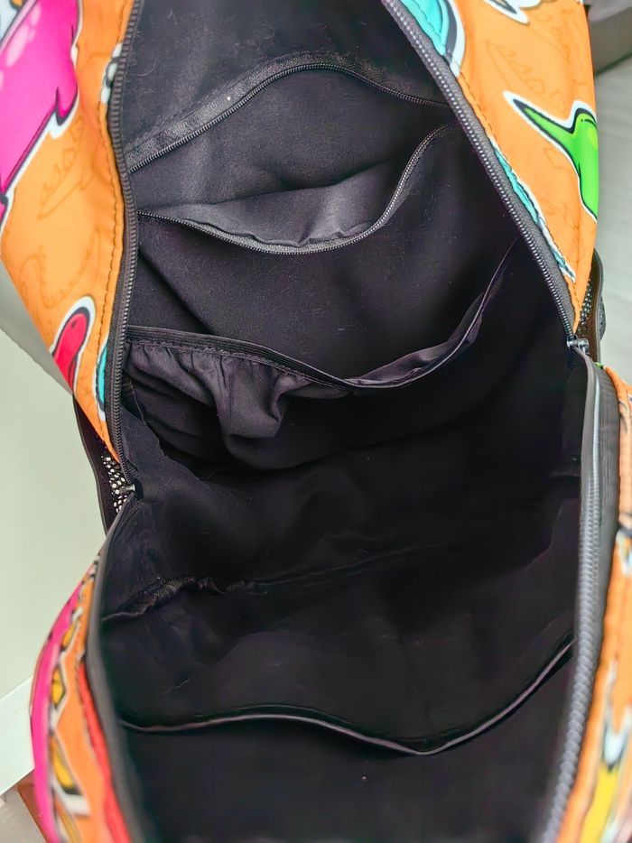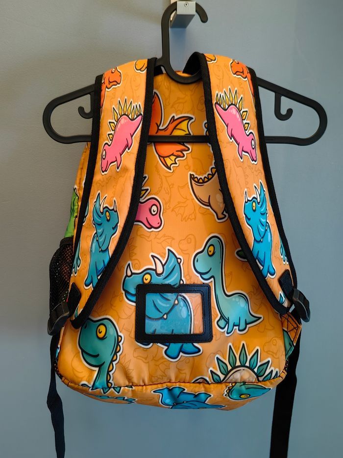 Sac dino Idéal primaire Nombreuses poches intérieures dont 1 à zip Poche extérieure à zip 2 filets latéraux extérieurs (pour gourde par exemple) Bretelles rembourrées Pochette plastique transparente au niveau du dos pour insérer une carte avec le nom de l'enfant et les coordonnées Servi 3 mois. Très bon état