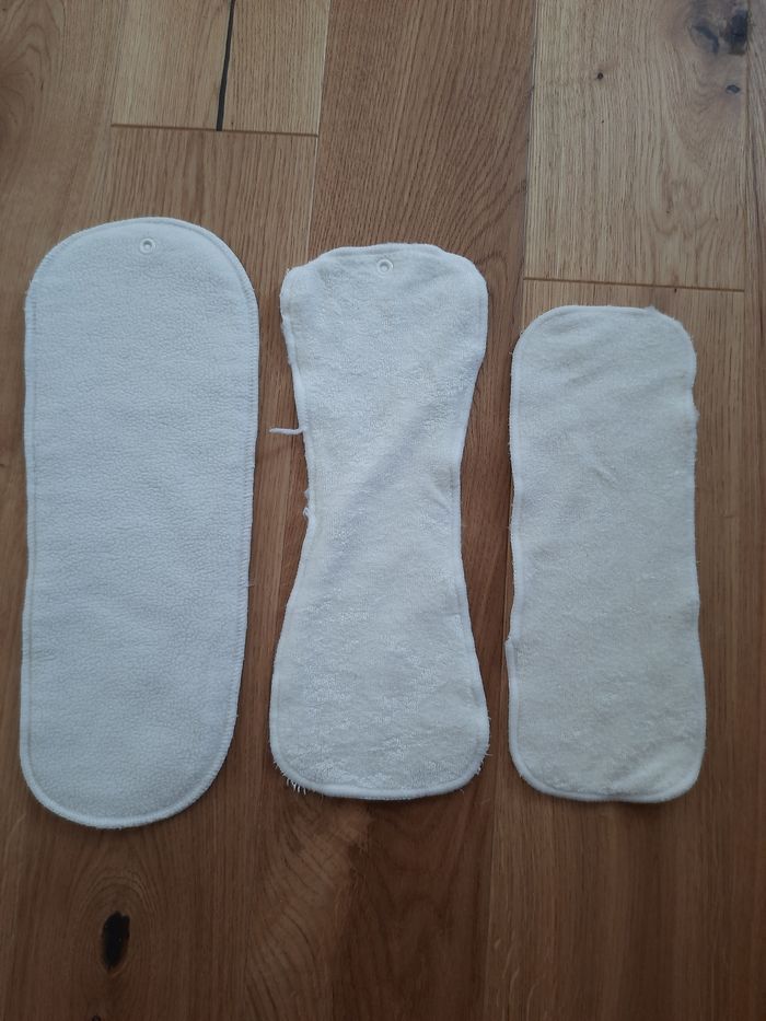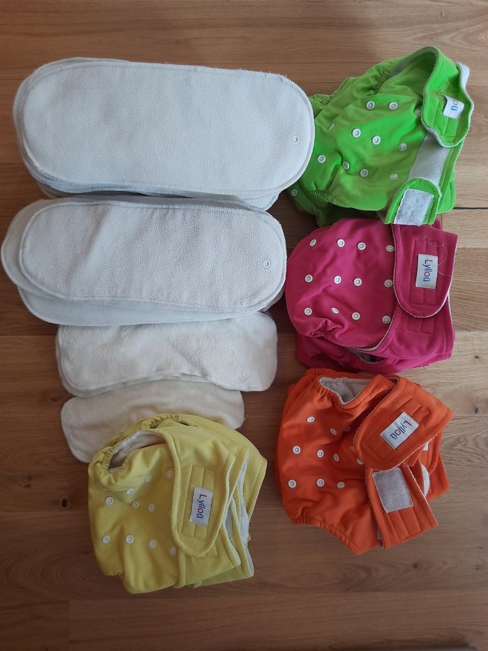 16 couches à poche pour insert avec boutons pressions (4 vertes, 4 roses, 4 jaunes et 4 oranges) 31 inserts L avec bouton pression 5 inserts M avec bouton pression 1 insert S sans bouton pression Nous les avons acheté d'occasion mais nous ne nous en sommes jamais servi. Bon lavage et bon décrassage à prévoir. Certains inserts ont un peu veillis (moins blancs et 1 insert avec une couture qui a lâchée par endroit)