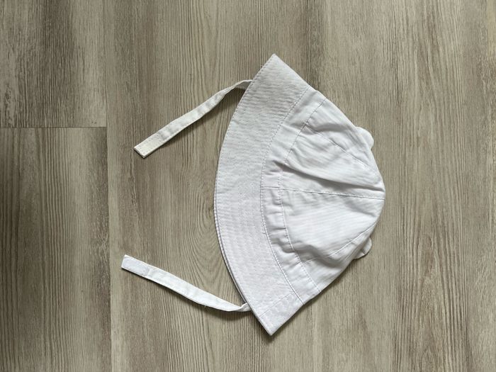 Chapeau blanc avec petites oreilles Neuf jamais porté Trop grand pour mon fils l’été dernier et trop petit cette année 😅 Taille 1-6 mois sur l’étiquette mais je dirais plutôt un 6-9 mois en réel (taille grand)