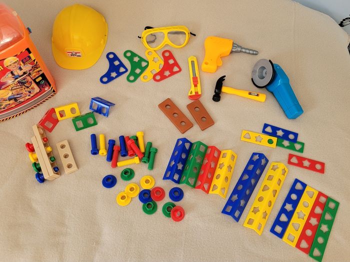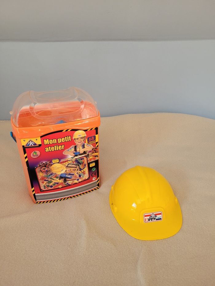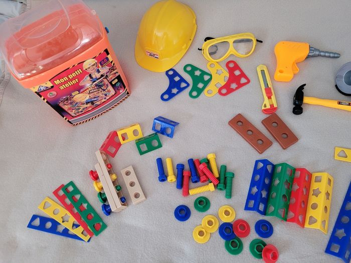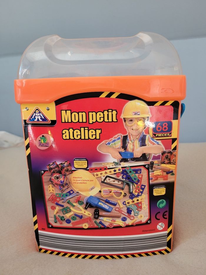 Jeu mon petit atelier playland En bon état, reste 60 pièces Le casque n'a plus la lanière pour le fixer sur la tête A partir de 3 ans