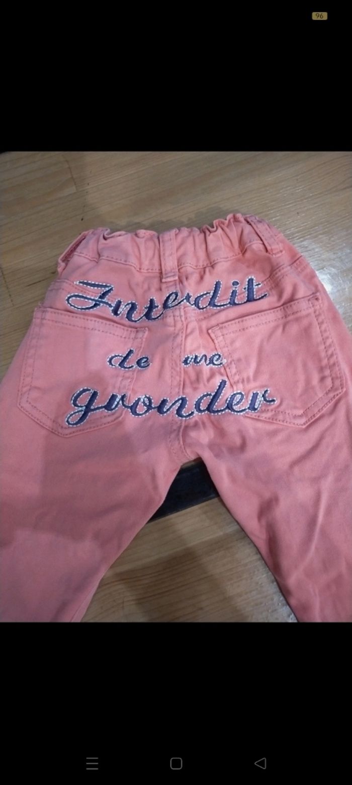 Taille grand. Rose. Inscription "interdit de me gronder" en violet sur les fesse. Fermeture par braguette et bouton.