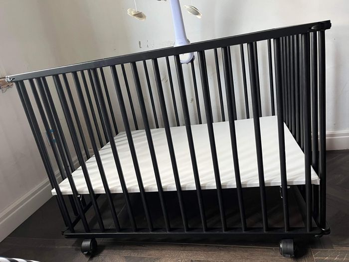 Parc en bois noir Sur roulette Léger à déplacer Solide 3 niveaux Parfait état Se replie pour prendre très peu de place 100€