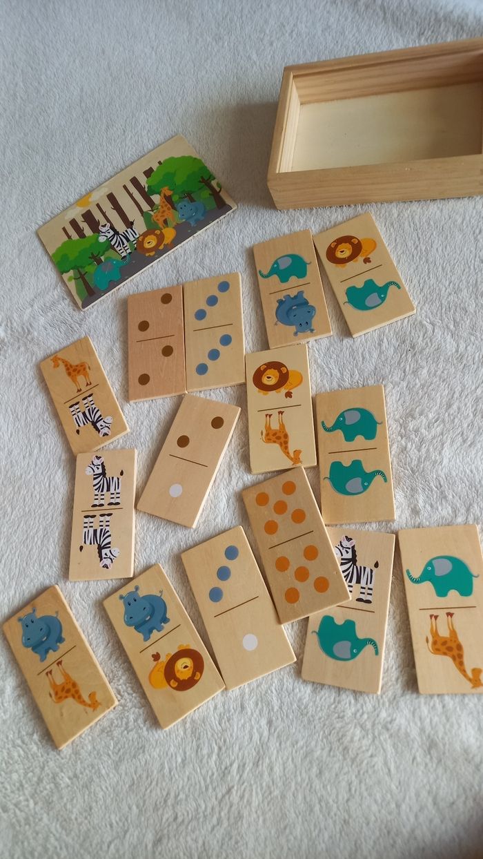 Coffret de 15 dominos en bois Double face animaux de la savane et nombres. Marque Playtive A partir de 2 ans Très bon état.