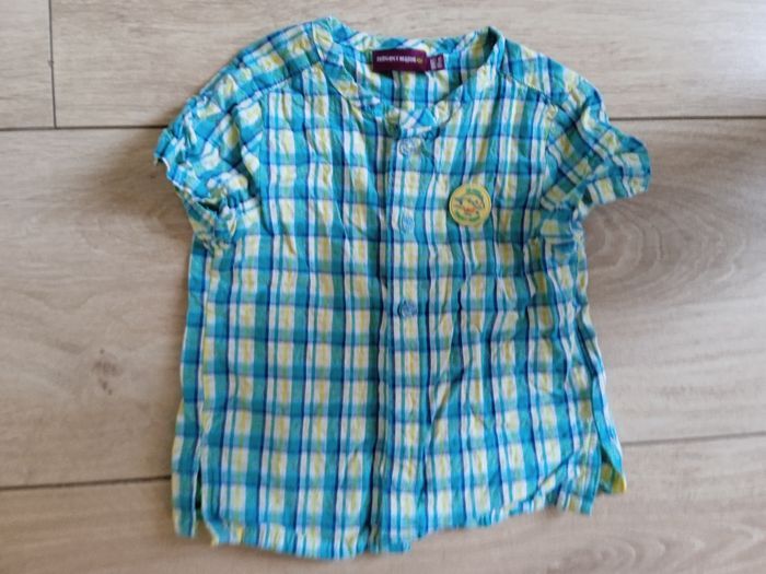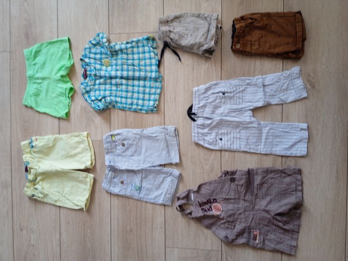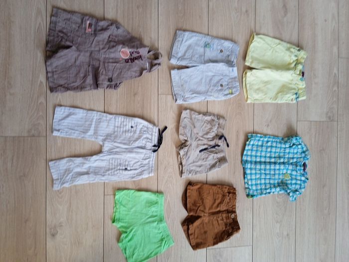 Lot 8 articles Kiabi, Sergent major 5 shorts 1 pantalon rayures léger 1 salopette 1 chemise manches courtes En bon état en taille 18 mois