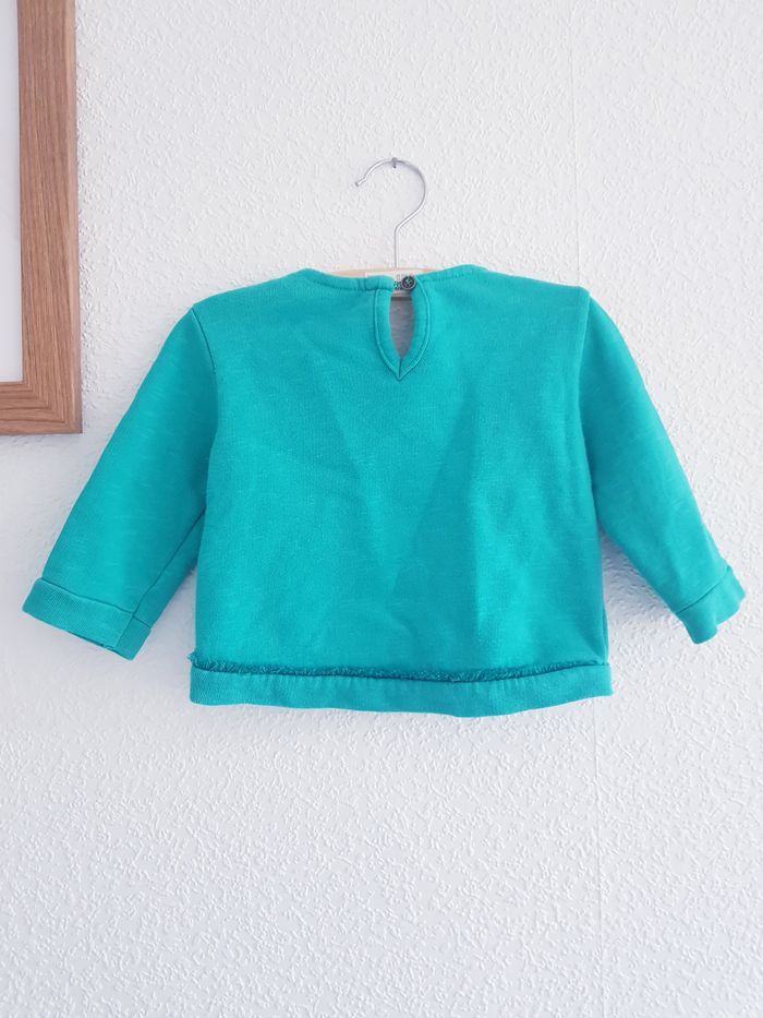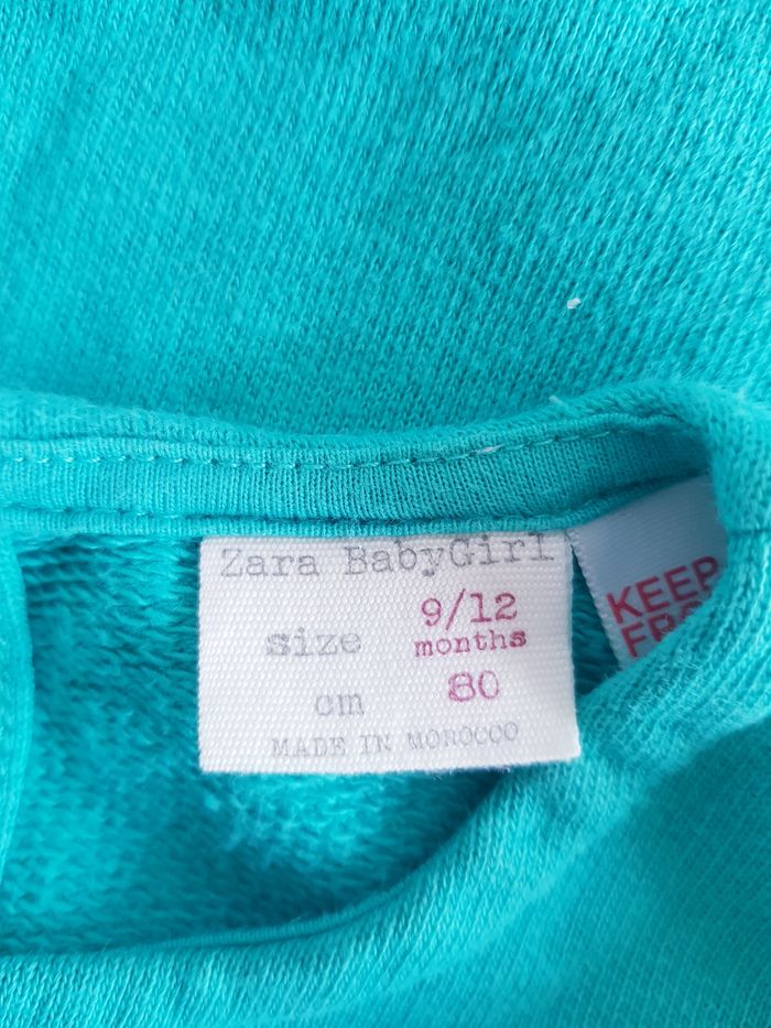 Pull à manches longues Marque : ZARA Couleur : vert Taille : 9/12 mois - 80 cm État : très bon état Étiquette des matières découpée Retrait sur place ou envoi.