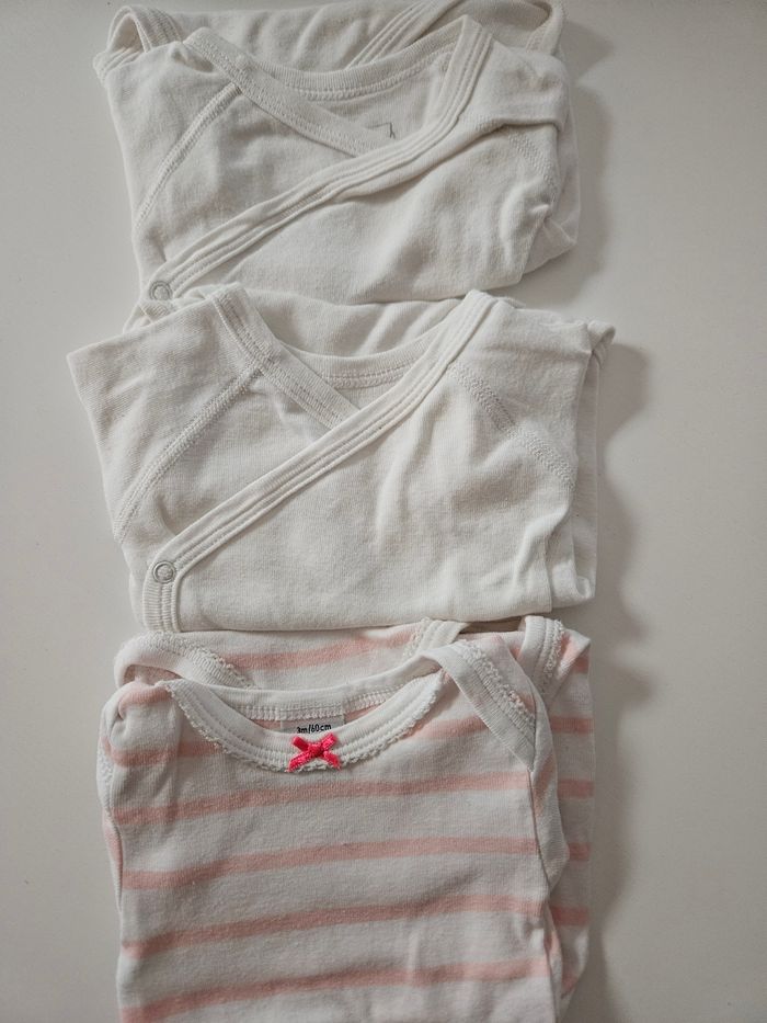 Lot 3 bodies petit bateau 2 s'ouvrent sur le devant 1 s'enfile par la tête Blanc pas de taches Taille 3 mois
