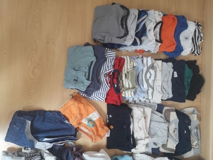 Un très grand lot de vêtement hiver taille 6 mois pour garçon. Plusieurs bodes, t-shirts manche longues, pantalons, pyjama et 1 salopette ainsi qu'un gilet sans manches.