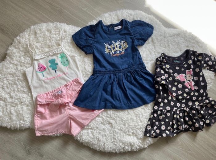 Trois tenues Taille 6 mois. neuf sans étiquettes pas portés. 1 robe Disney 1 débardeur + short et 1 robe lulu castagnette