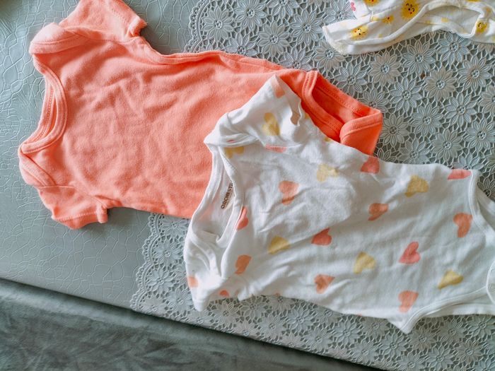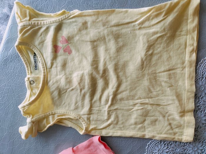 Je vends deux bodies en très bon état de chez Orchestra, deux t-shirts en très bon état de chez Orchestra aussi et pyjamat-short neuf de chez Primark.