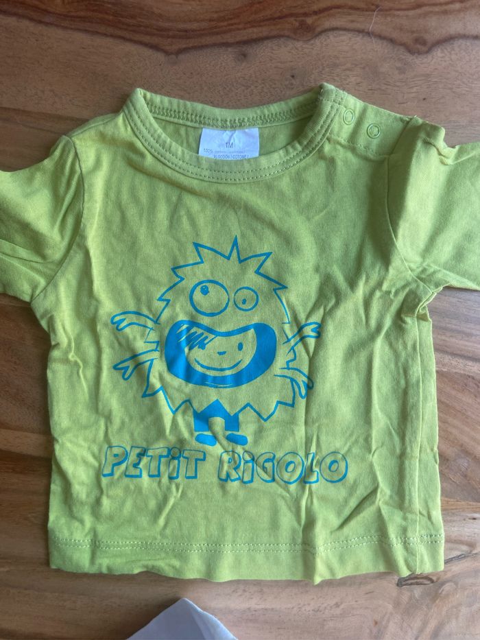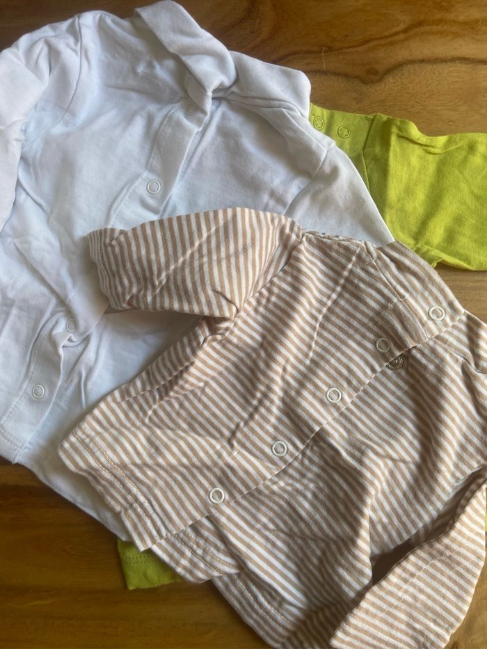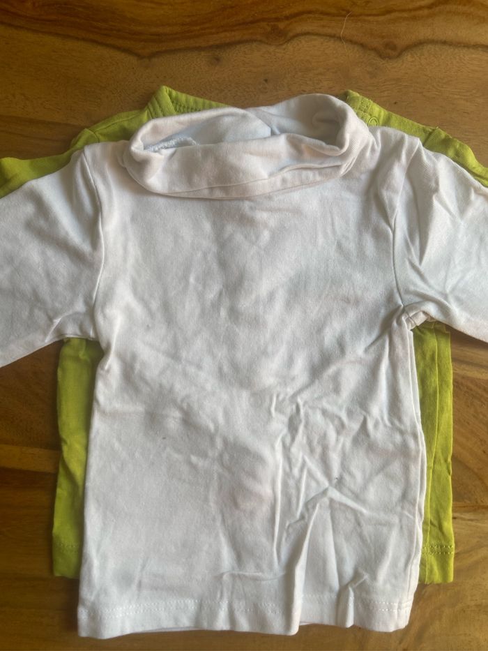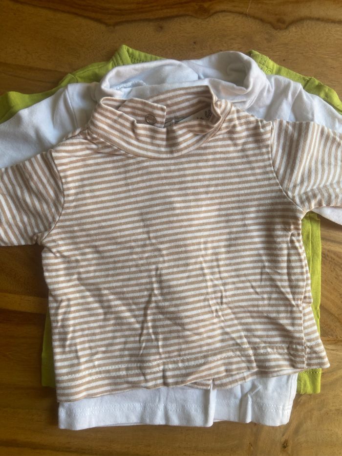 Lot de 3 t-shirt manches longues Le rayé : naissance grain de blé Le Col roule blanc : 1 mois Kiabi le vert 1 mois kimbaloo Très bon état