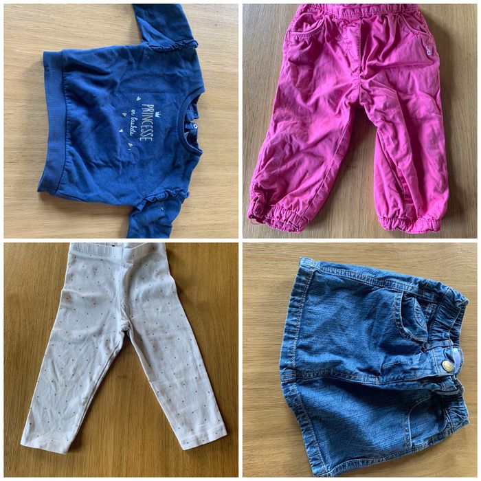 Ce lot comprend: 5 pantalons 4 legging 1 jupe 4 chemisiers 1 tee-shirt manches longues 1 pyjama chaud 1 sweat 3 combi short 3 robes manches longues 7 robes manches courtes 1 veste