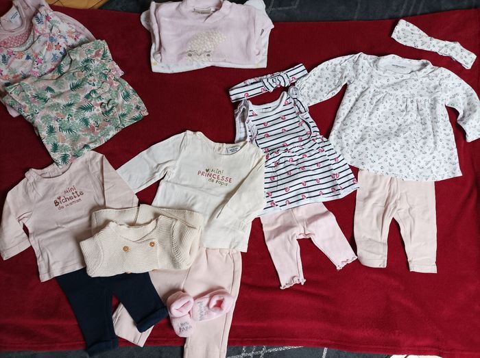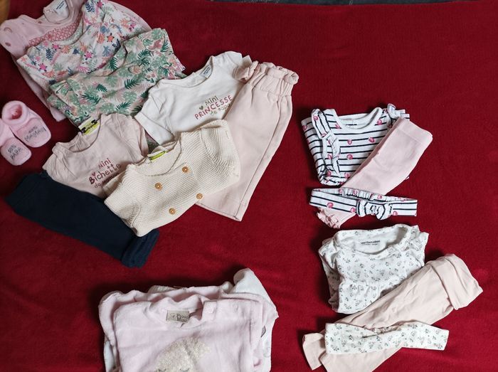 Vends lot de vêtements bébé 1 mois 3 ensembles manches longues dont un recousu(voir photo) 1 ensemble sans manche avec son leggings 3 pyjamas dont un offert Toute marque: - Tape à l'œil -Verbaudet -Primark