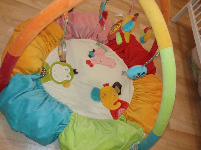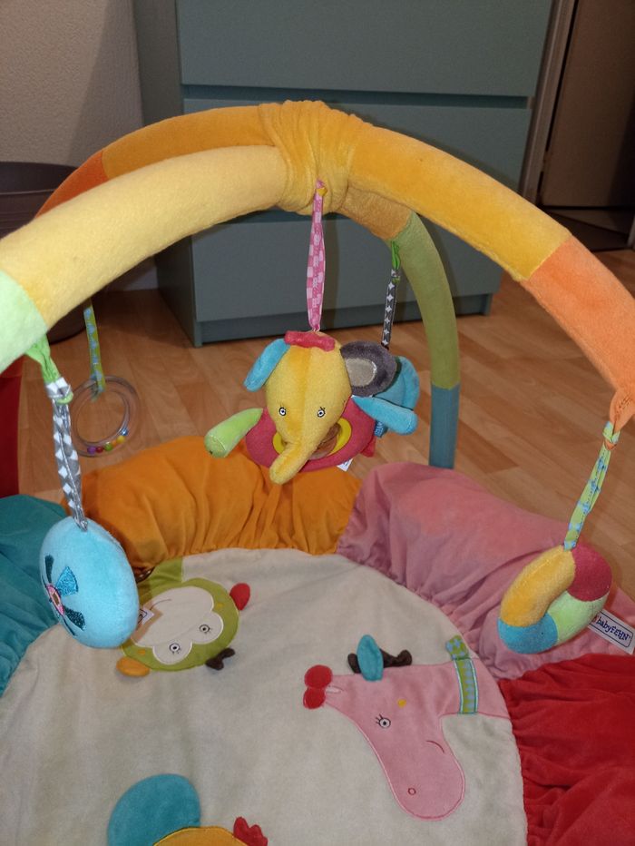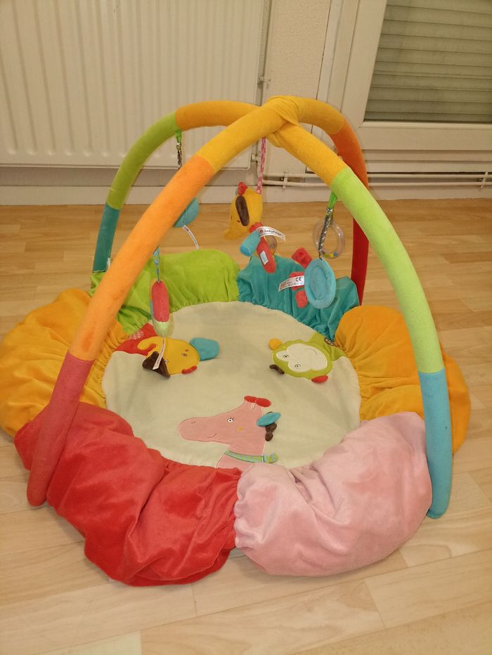 Tapis d'éveil multicolore, avec jouets suspendus. Rebords rembourrés.