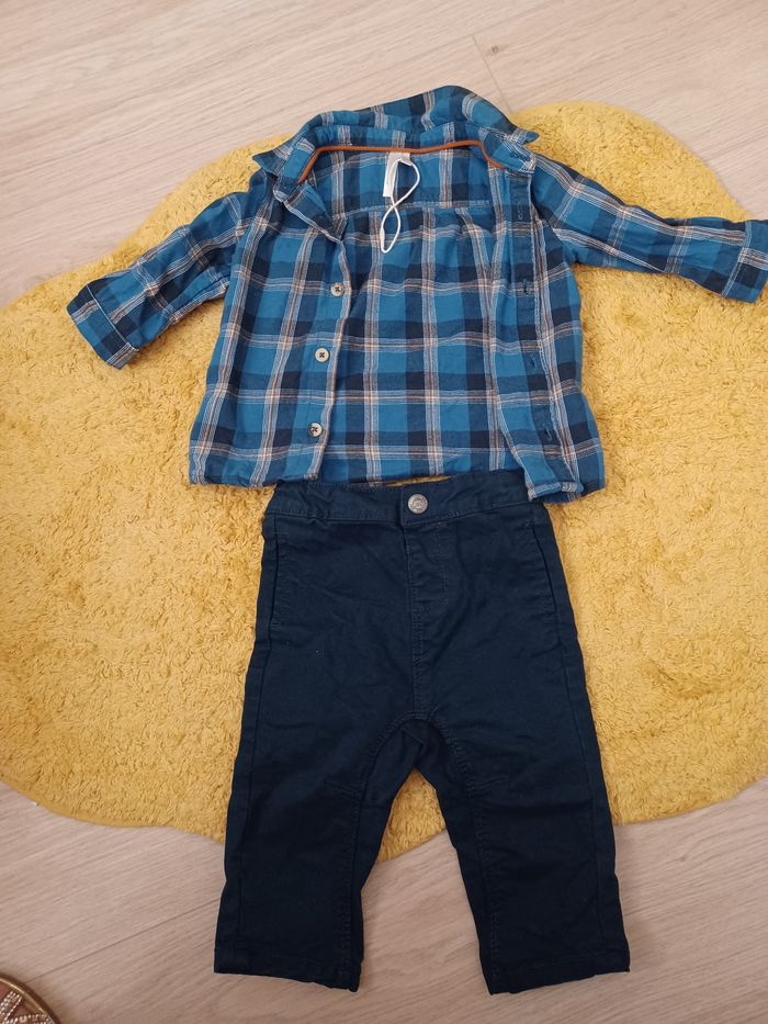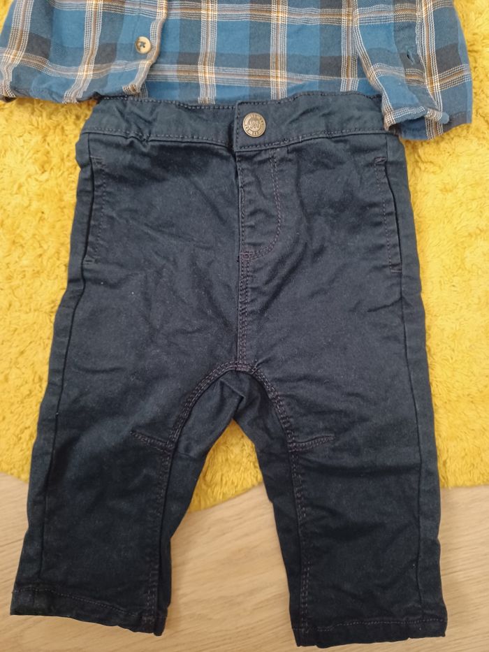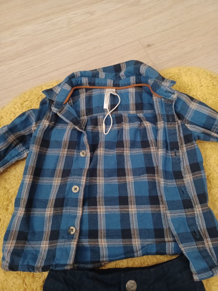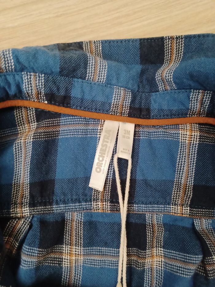Ensemble orchestra composé d'une petite chemise à carreaux bleu et d'un pontalon bleu marine. Porté 1 fois.
