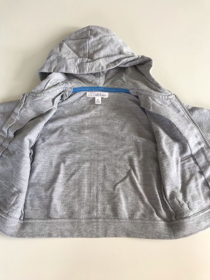 Sweat zippé à capuche gris clair. Taille 9 mois.