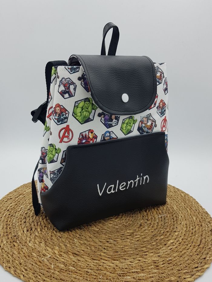 Sac à dos personnalisé pour garçon Tissu Avengers Simili noir Dimensions 25 cm x 22 cm Idéal pour la crèche ou la maternelle Poche avant et grande poche principale Broderie offerte et au choix Fermeture par bouton pression à l'avant et sur les cotés pour que rien ne sorte du sac Bretelles réglables en option sinon standard Composition : coton et simili cuir Le sac est doublé pour plus de résistance et imperméabiliser Écrivez moi pour m'indiquer le prénom à broder ou je prendrai contact avec vous N'hésitez pas à me contacter si des questions demeures. Vous pouvez également consulter mon site internet : www.natcoud.fr