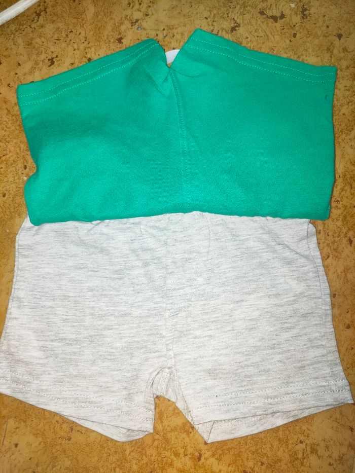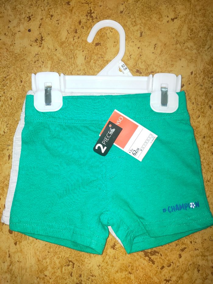 1er short de couleur vert, avec motif et inscription 2eme short de couleur gris