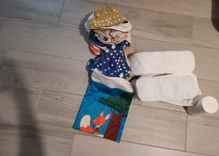 Vends 16 couches lavables + inserts + sac imperméable + voiles de protection biodégradables. Neuf jamais utilisé. Marque : My baby nappy
