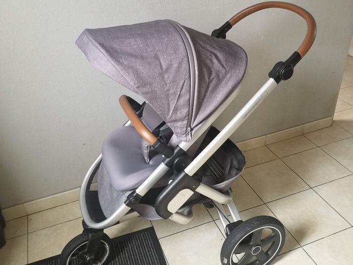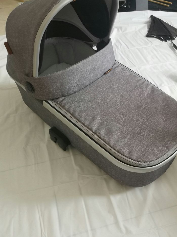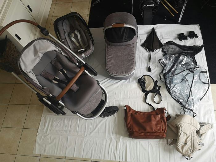 Poussette Nova 3 roues. De 0 à 15 kg (de la naissance à 3.5 ans environ)light grey. Poucette pratique sur tout terrain. Quelques griffes d'usure. Siège auto pebble pro i-size essential light Grey. Nacelle oria light grey avec un vrai matelas pour le sommeil de bébé. 2 bâches plastiques anti pluie et un filet anti insectes qui s'adapte aux différents elements Une ombrelle marron 1 miroir pour voiture Un sac à langer et un porte bébé tomy.